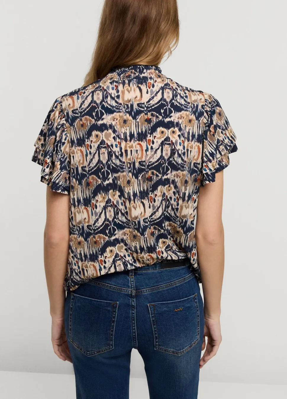 Top Met Vlindermouw Met Een Overall Ikat-Print, Gemaakt Van Rekbare, Zachte Jersey Stof. De Top Heeft Een Relaxte Pasvorm En Een Ronde Gemokte Kraag.