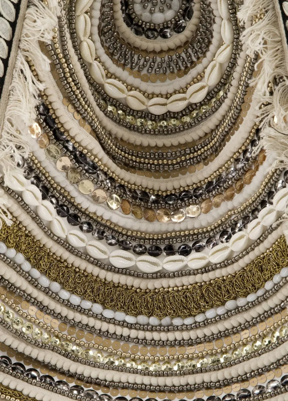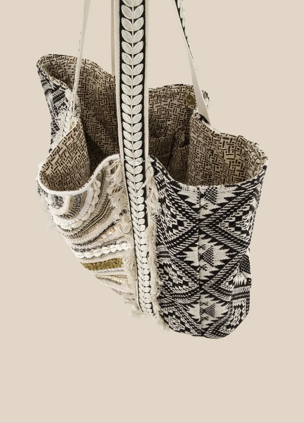 Tote Bag Met Jacquard Stof In Geometrisch Patroon En Versierd Met Kralen Borduurwerk. De Schoudertas Heeft Stoffen Hengsels, Twee Aparte Binnenvakjes En Een Drukknoopsluiting.
