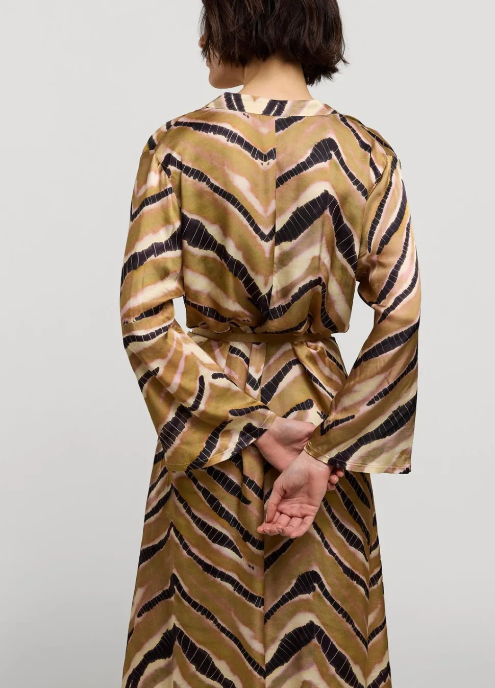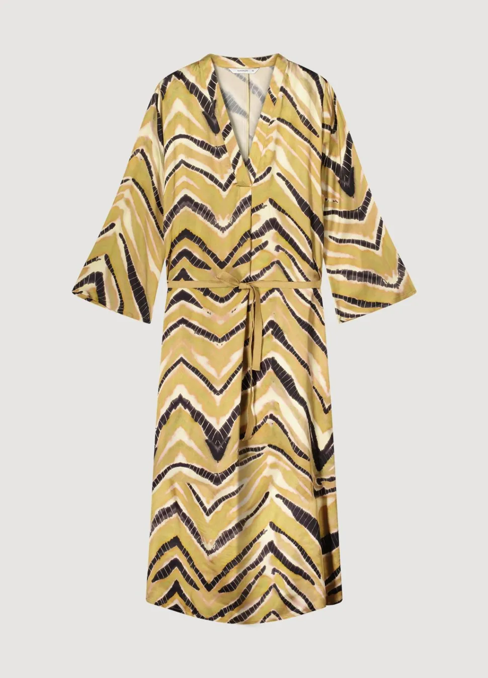 Tuniekjurk Met V-Hals Van Licht Glanzende Viscose. De Jurk Heeft Iets Uitlopende Mouwen, Steekzakken In De Zijnaad En Een Keperbandje In De Taille.