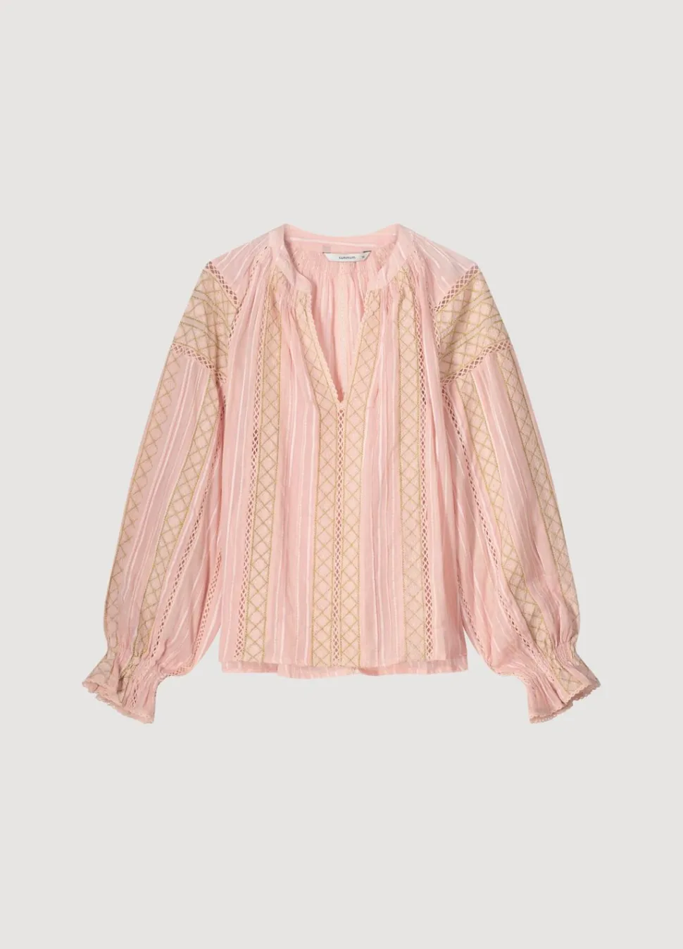 Voile Blouse Met Kantdetails En Geometrisch Borduurwerk In Goudkleurig Garen. De Blouse Heeft Een Ruime Fit, Ballonmouwen Met Gesmokte Boorden En Is Gemaakt Van Een Zachte Katoenen Geweven Stof.