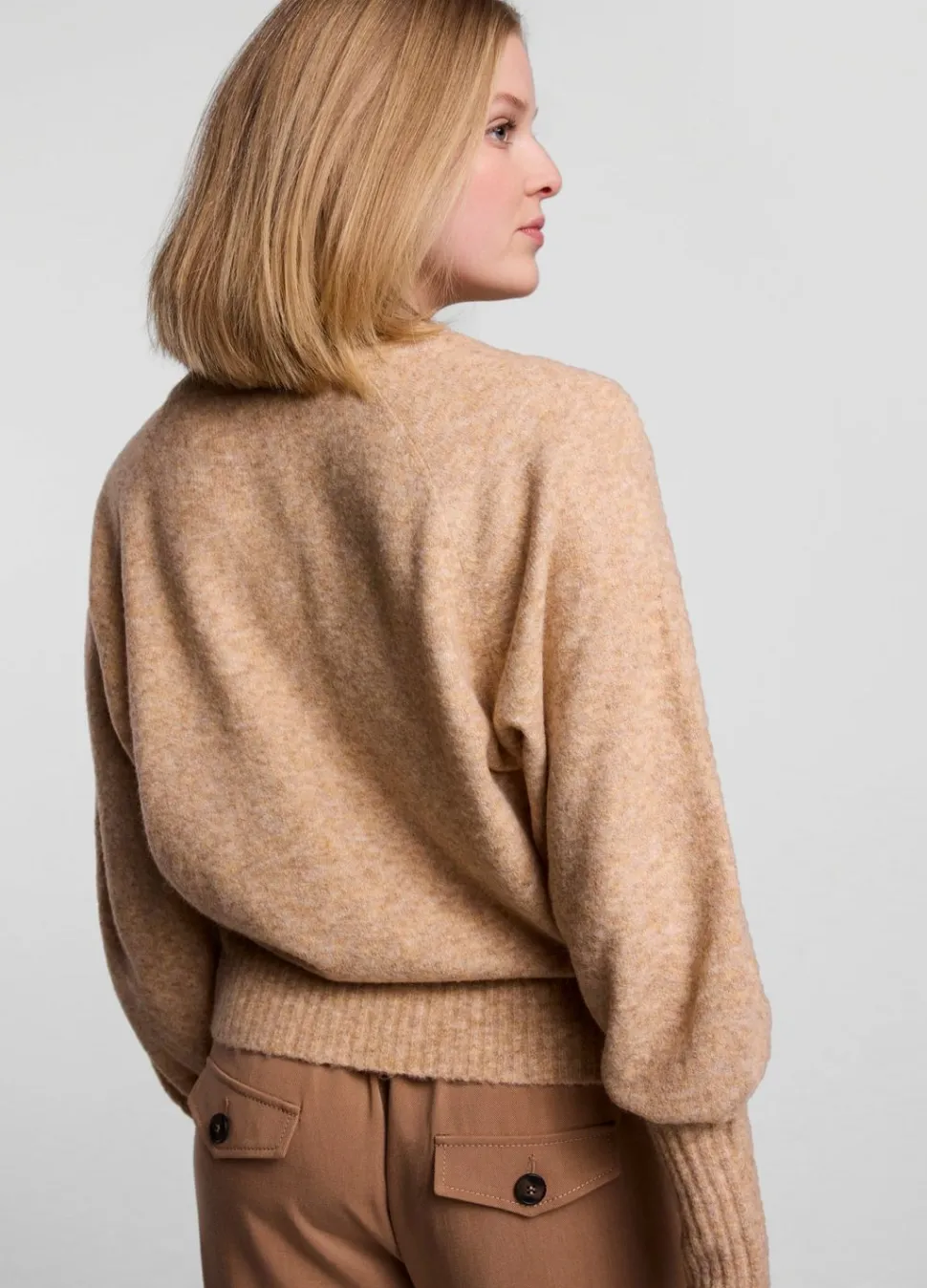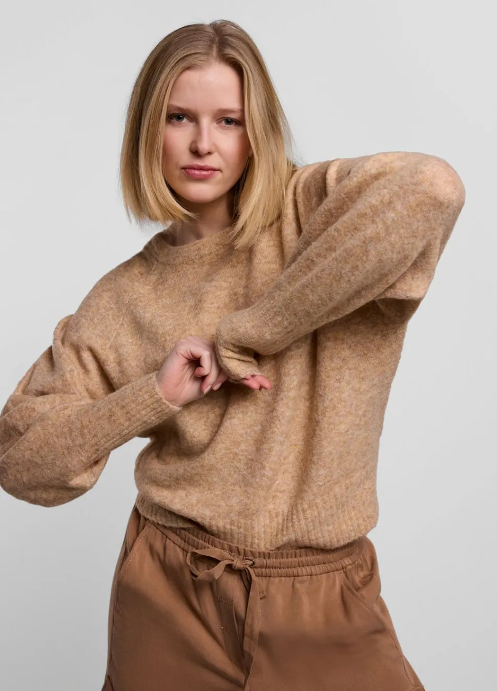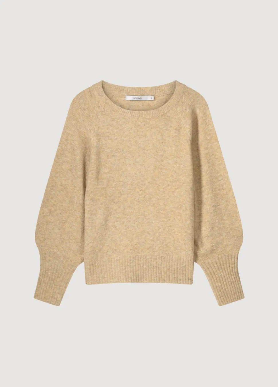 Zachte Gebreide Trui In Een Gemêleerde Garenmix. De Trui Heeft Een Ruime Ronde Hals En Pofmouwen Met Brede Boorden Aan De Mouw.