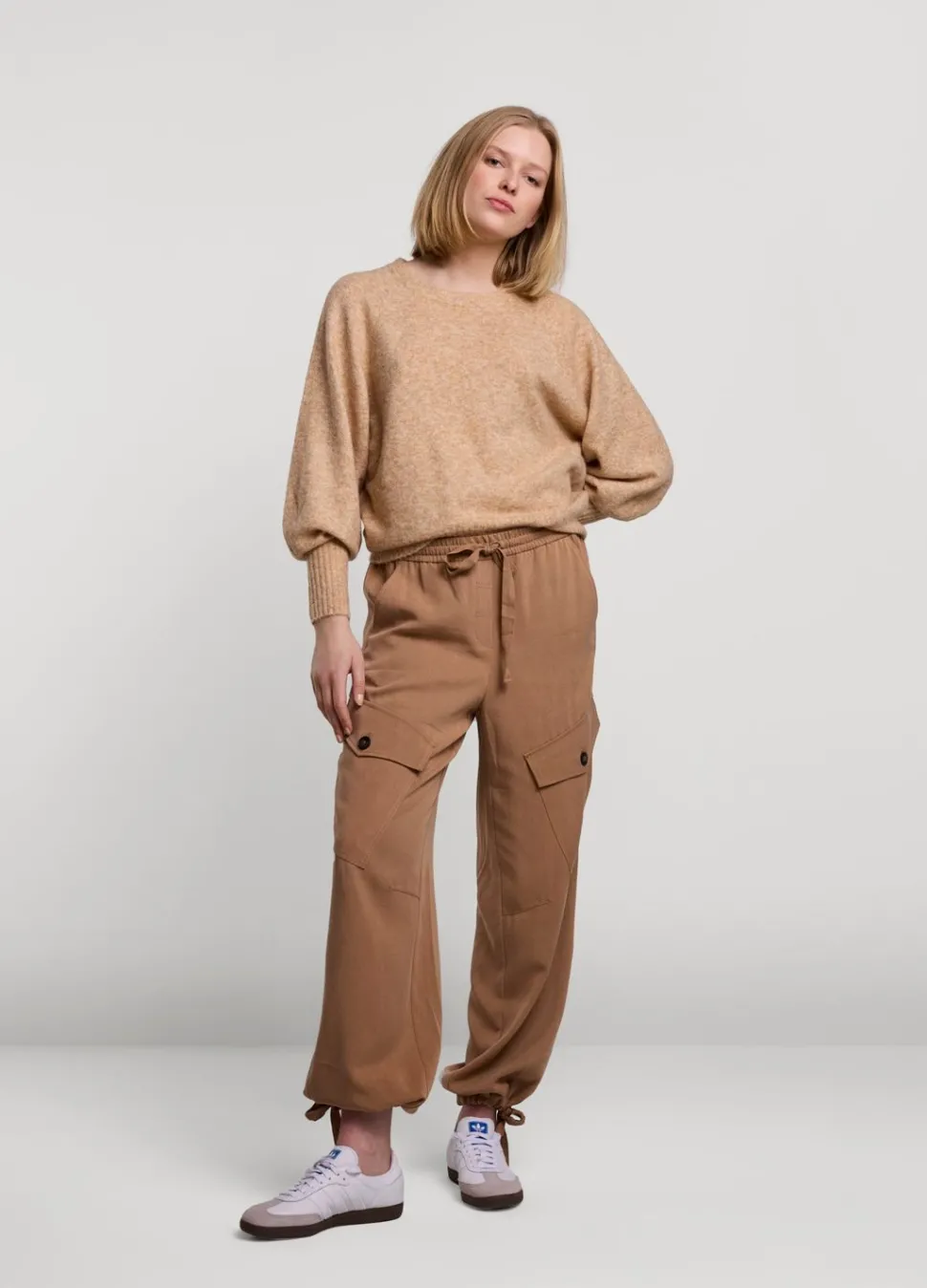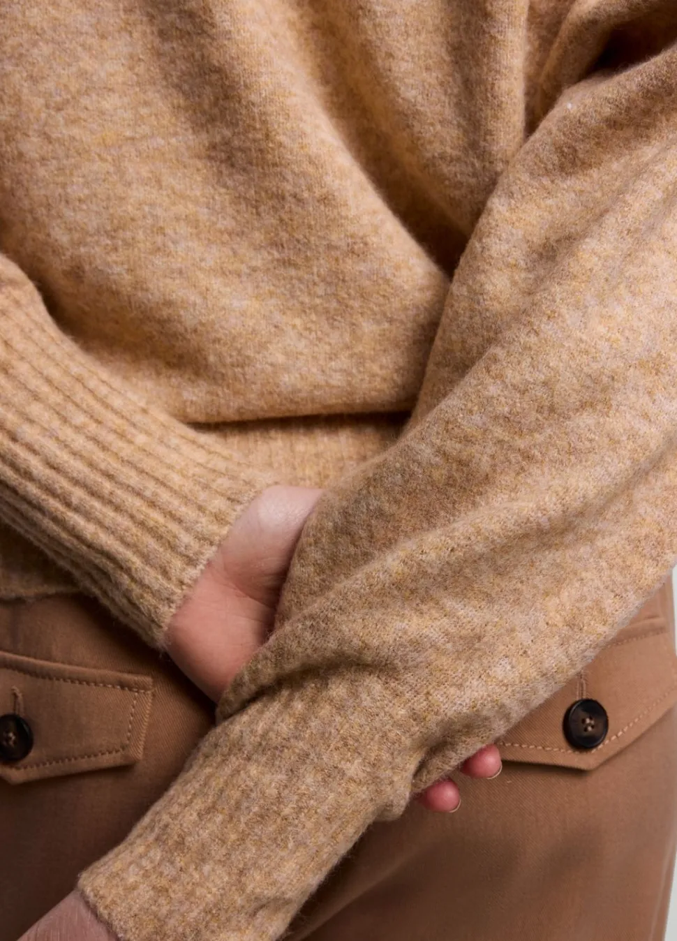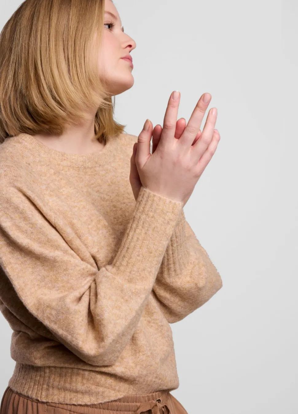 Zachte Gebreide Trui In Een Gemêleerde Garenmix. De Trui Heeft Een Ruime Ronde Hals En Pofmouwen Met Brede Boorden Aan De Mouw.