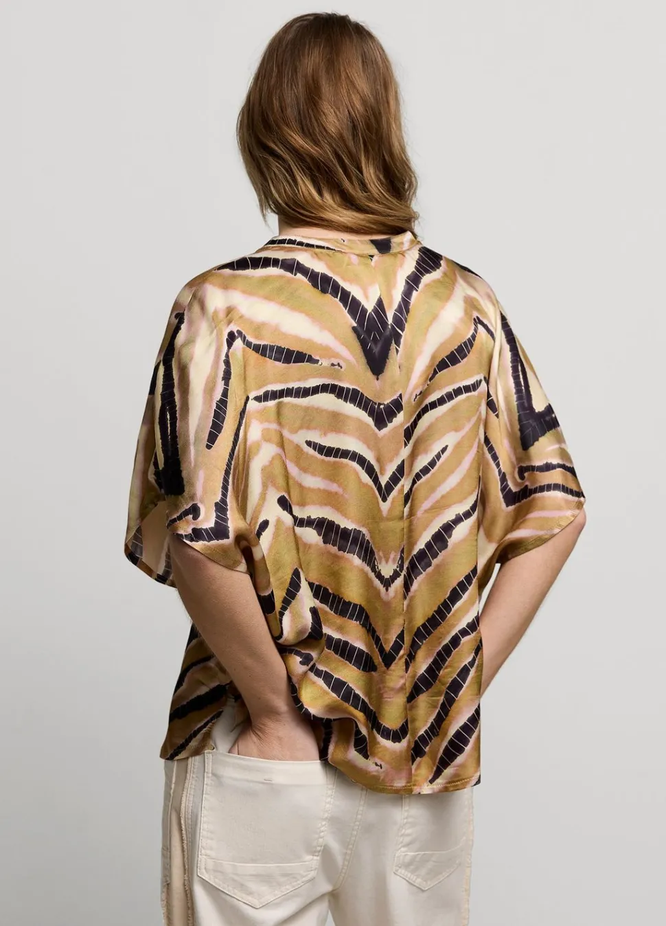 Top Van Licht Glanzend, Soepele Viscose Met Een Artistieke Zigzag-Print. De Top Heeft Aangeknipte Wijde Mouwtjes En Een Staanderkraag Met V-Split.