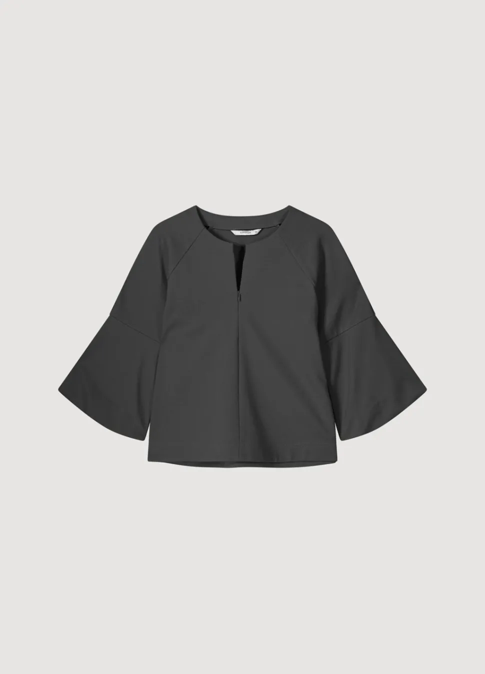 Aangesloten Top Met Een Ronde Hals En Split Met Een Blinde Rits. De Raglanmouwen Lopen Aan De Onderkant Wijd Uit.
