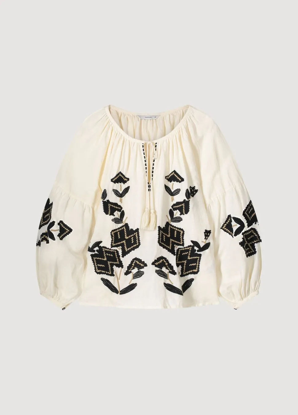 Ruimvallende Top Met Brede Ronde Hals In Een Zachte Katoen-Linnen Mix. De Blouse Is Versierd Met Borduurwerk En Heeft Een Koordsluiting Met Kwastjes.