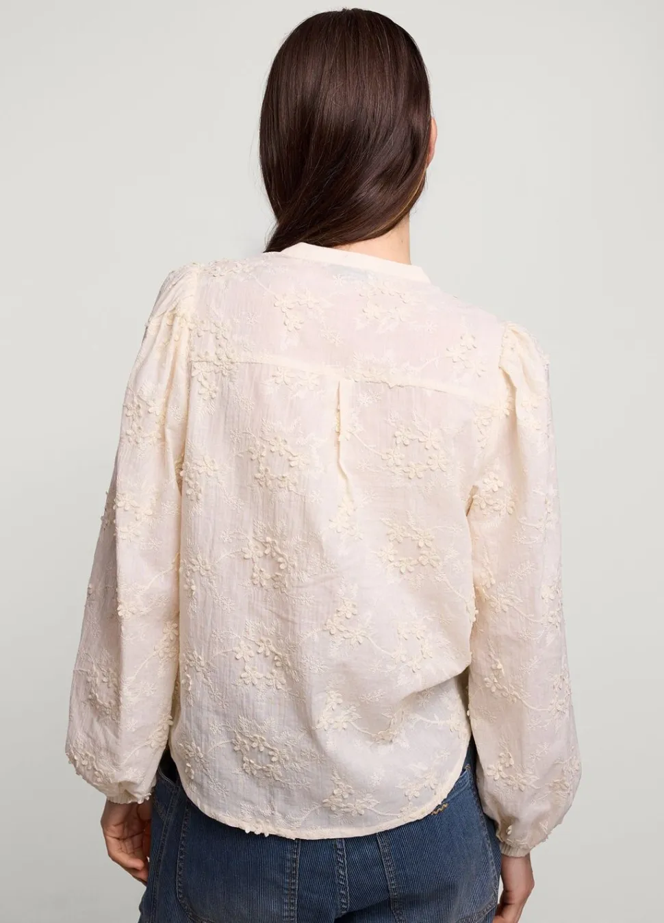 Blouse Van Comfortabel Katoen Met Opgelegde Bloemen. De Blouse Heeft Lange Ballonmouwen Met Elastiek En Een Ronde Hals Met Knoopsluiting