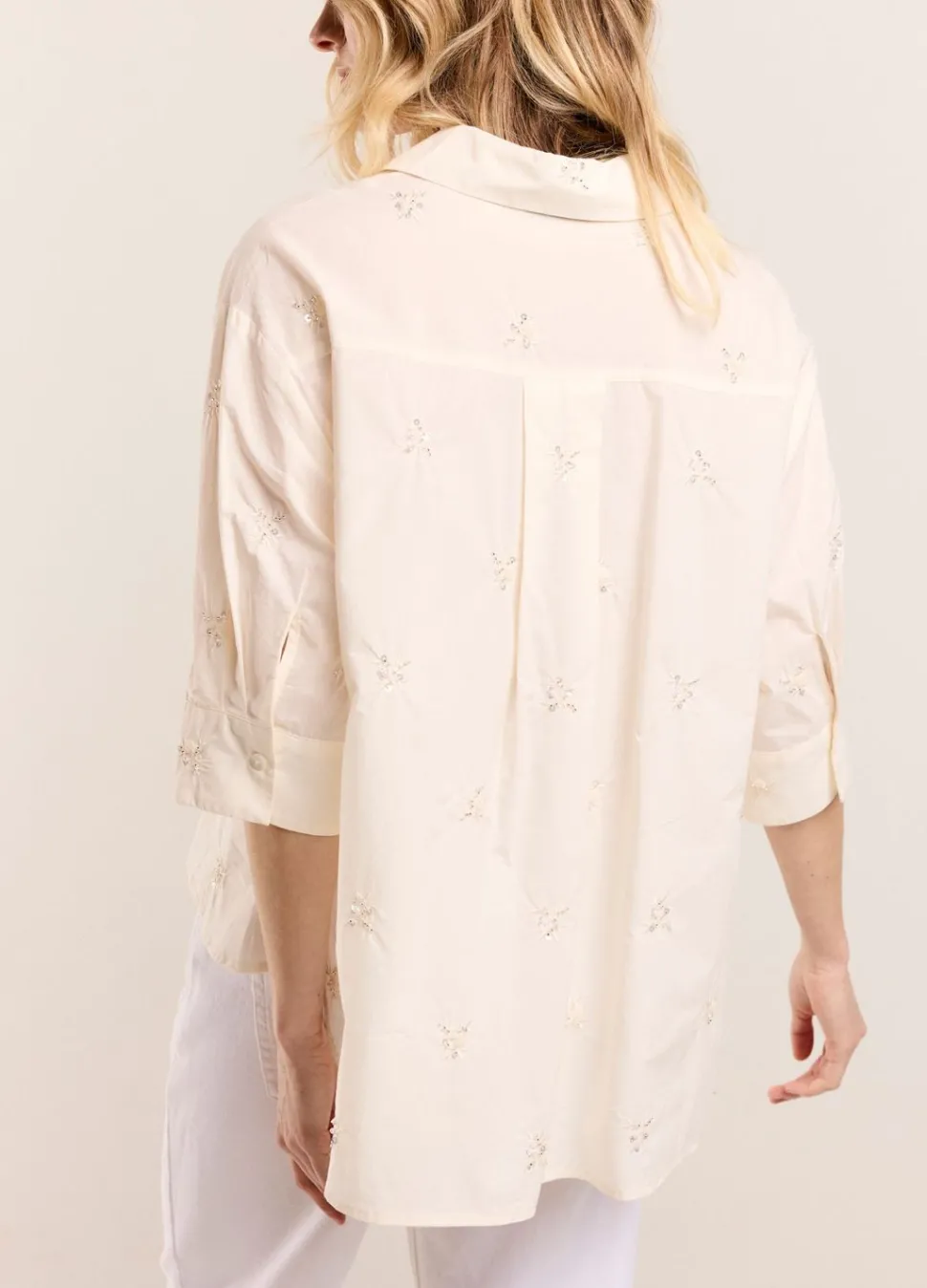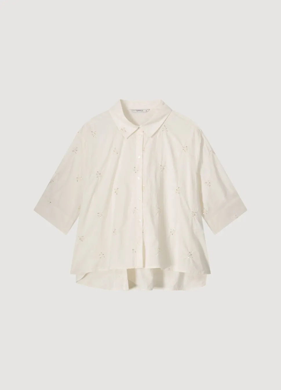 Blousje Met Relaxte Pasvorm In Een Lichte Katoenen Stof. De Blouse Is Versierd Met Kleine Geborduurde Bloemen En Heeft Een Knoopsluiting.
