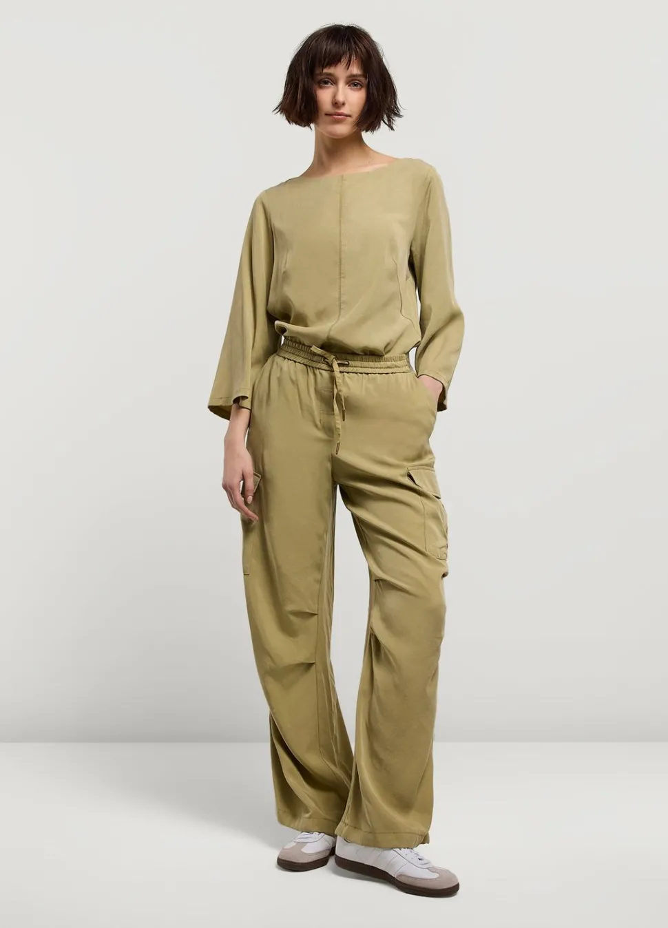 Soepelvallende Cargobroek Met Elastische Tailleband En Verstelbaar Elastiek In De Broekspijpen. De Broek Heeft Opgestikte Klepzakken Aan De Zijkant.
