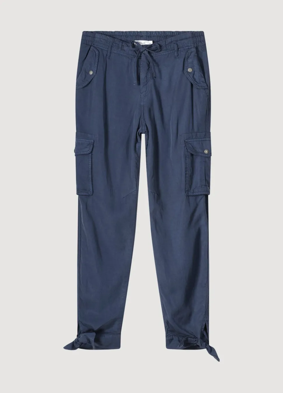 Soepelvallende Cargobroek Met Elastische Tailleband En Striksluiting In De Broekspijpen. De Broek Heeft Opgestikte Zakken Aan De Voorkant En Klepzakken Achter.