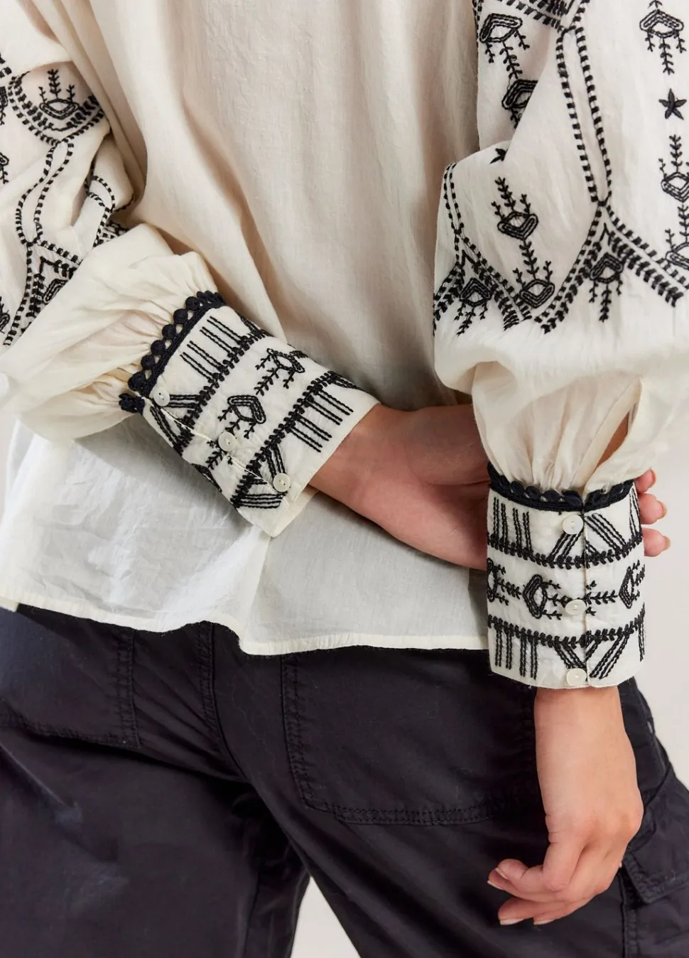 Ruimvallende Top Met Contrasterend Borduurwerk En Een Ronde Hals Met Split. De Top Is Geweven Van Zacht Katoen En De Lange Ballonmouwen Met Hoge Manchetten Zijn Versierd Met Borduurwerk.