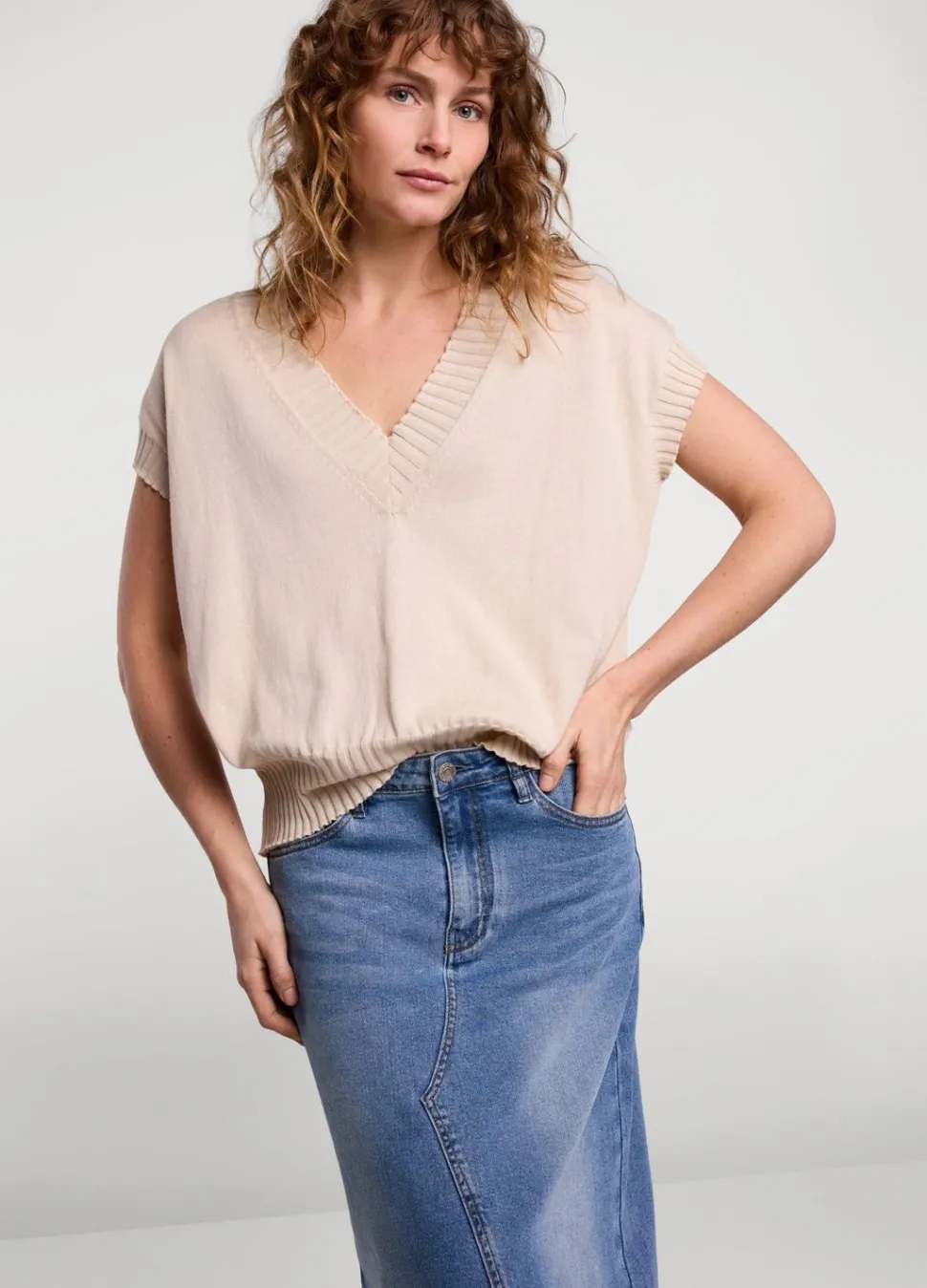 Luchtig Fijngebreid 100% Katoengaren Truitje Met Diepe V-Hals. De Top Heeft Grove Geribde Boorden.