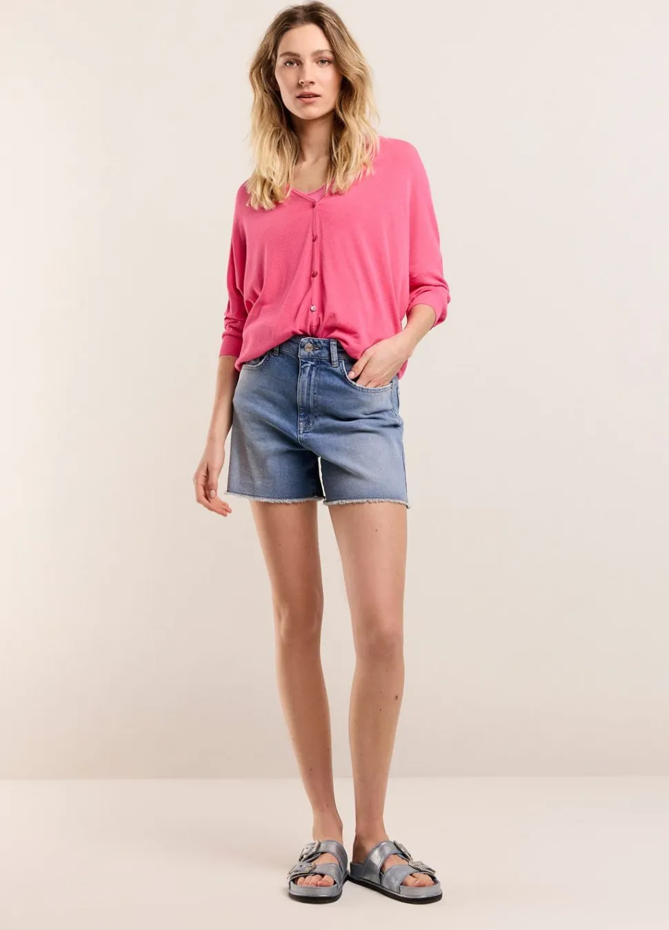 Fijngebreid Vest Met Diepe V-Hals En Knoopsluiting. Het Vest Heeft Een Loose Fit En Driekwart Mouwen Met Ribgebreide Boorden.