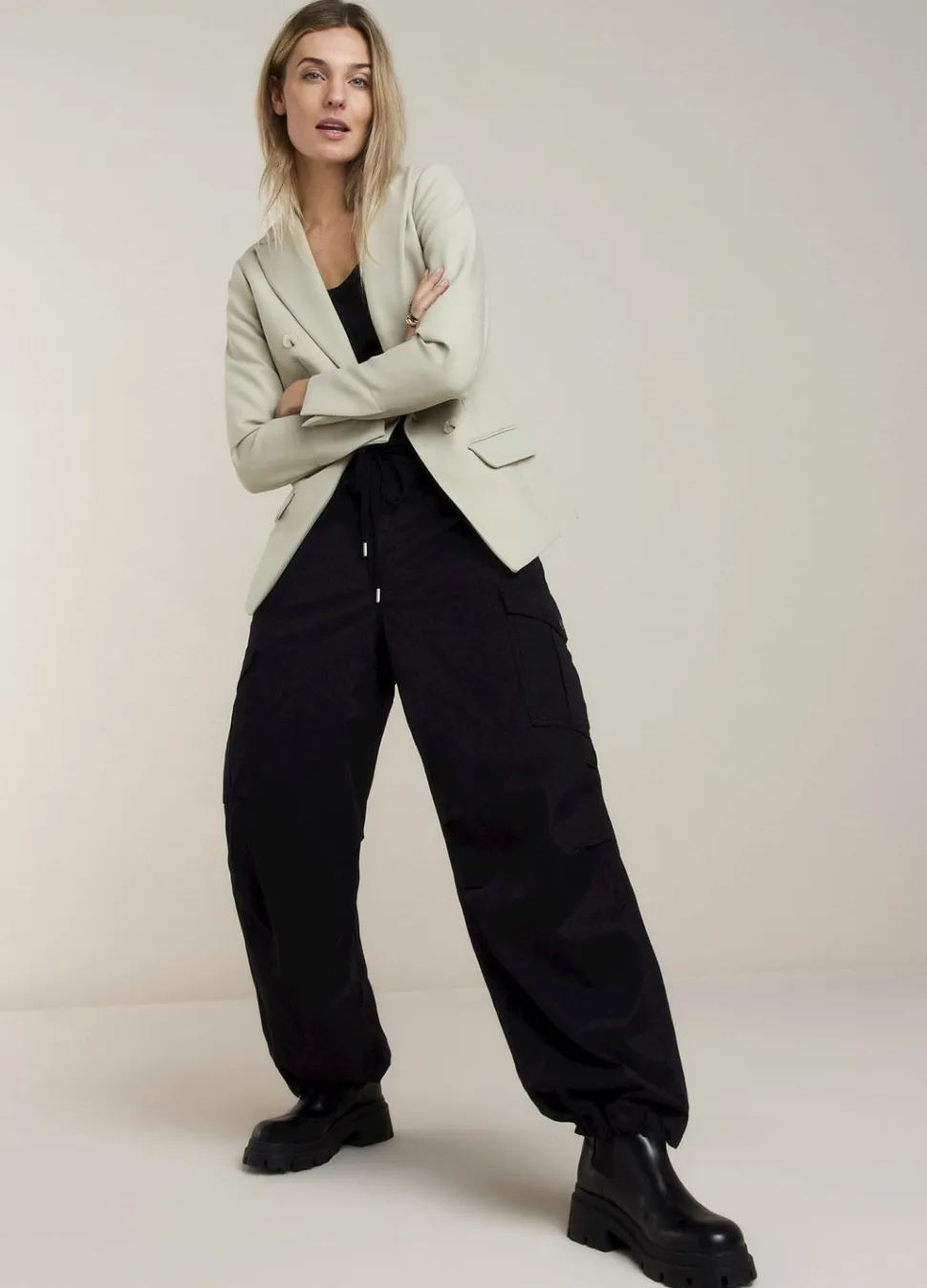 De Soft Foam Blazer Heeft Een Getailleerde Pasvorm En Een Schuine Knoopsluiting. Op Het Voorpand Zitten Twee Paspelzakken En Ton-Sur-Ton Accentknopen.