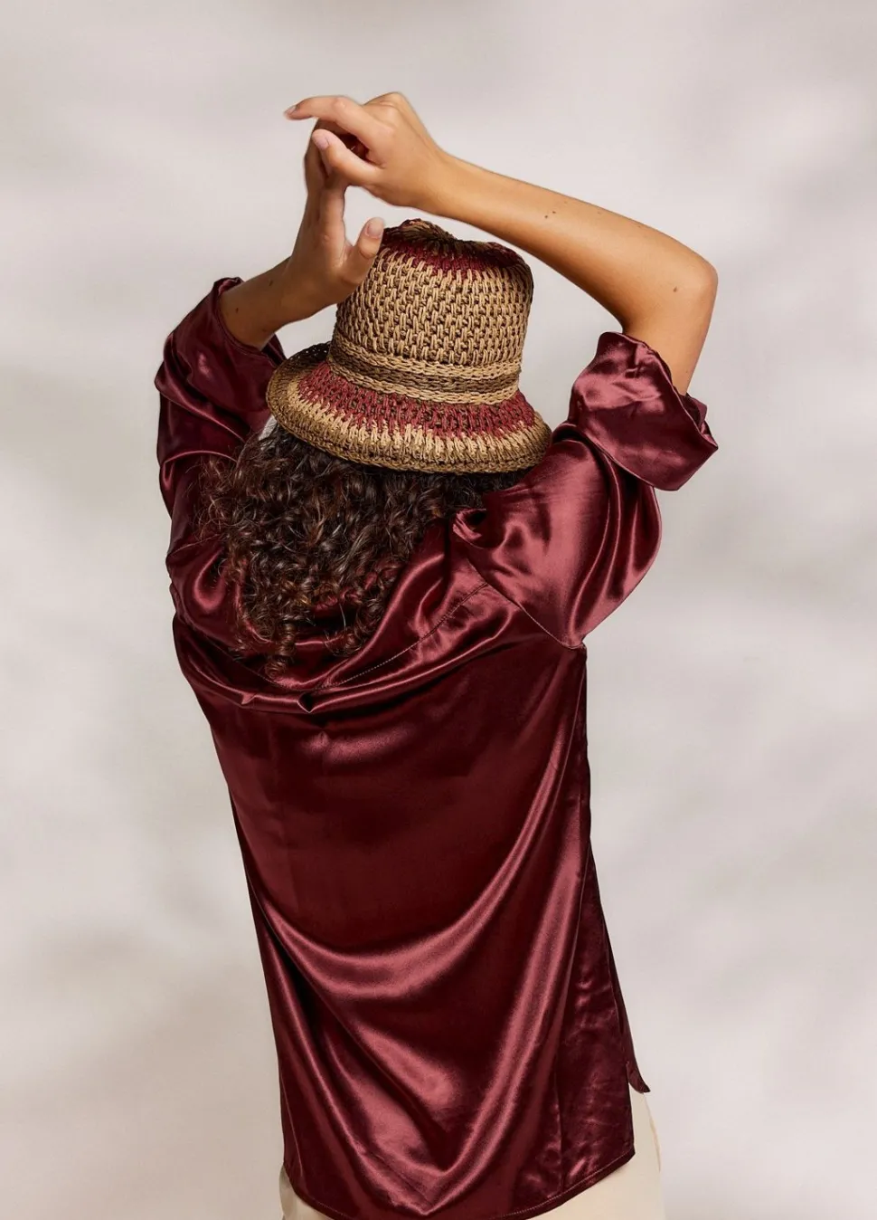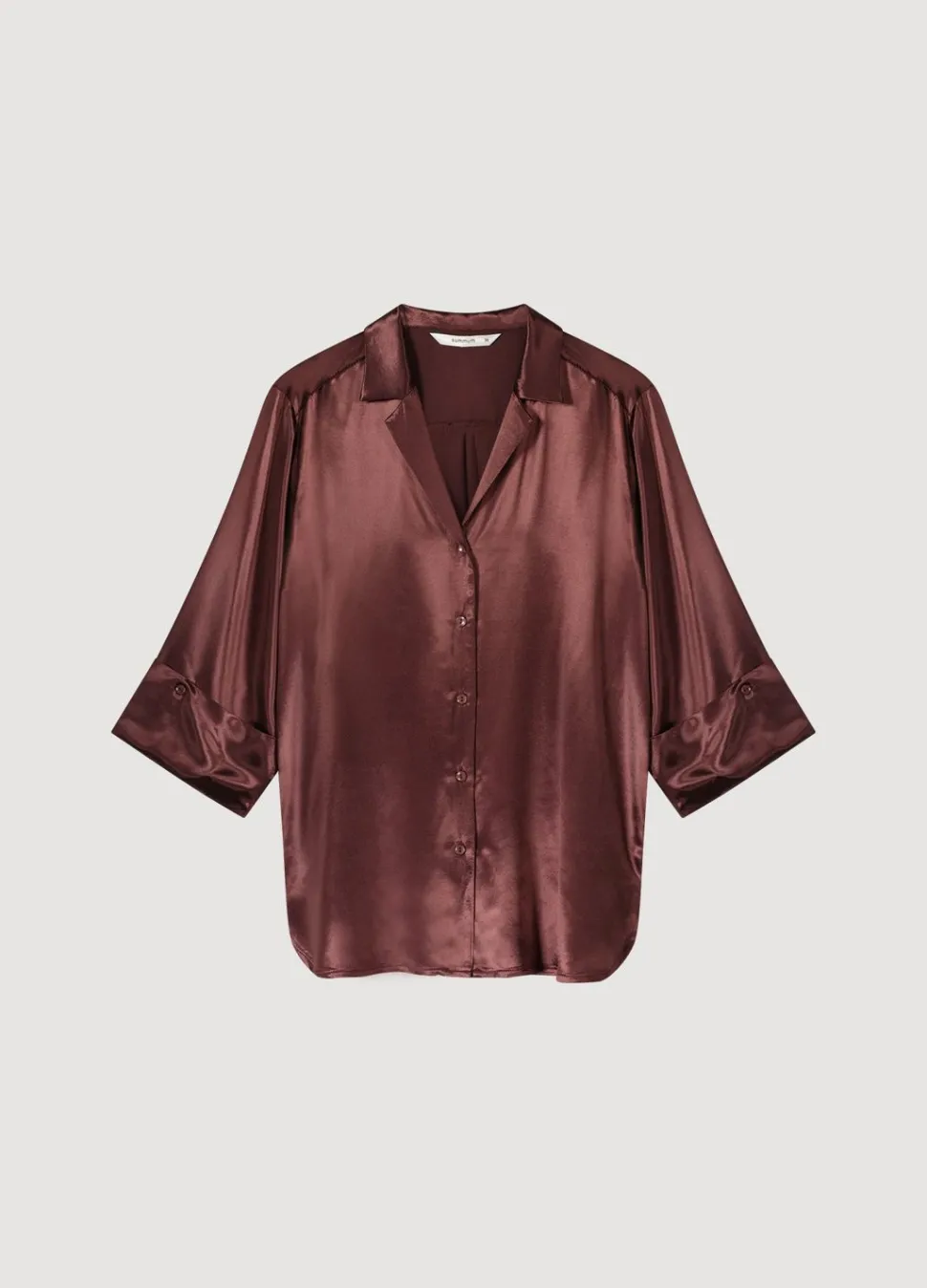 Glanzende Blouse Met Een Rechte Pasvorm. De Top Heeft Een Reverskraag, Iets Wijde Mouwen, Met Brede Manchetten Die Vastgezet Kunnen Worden En Een Afgeronde Voorkant.