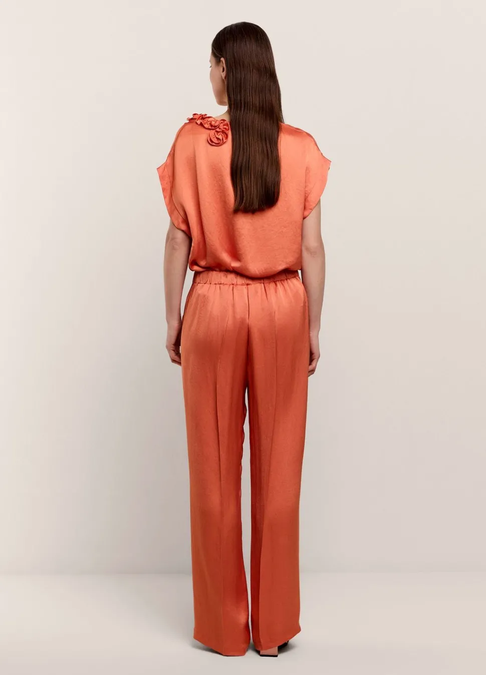 Broek Met Iets Wijde Pijpen In Een Soepelvallende, Glanzende Stof. De Broek Heeft Een Elastische Tailleband Achter, Steekzakken Voor En Een Persvouw Op Het Voorpand.