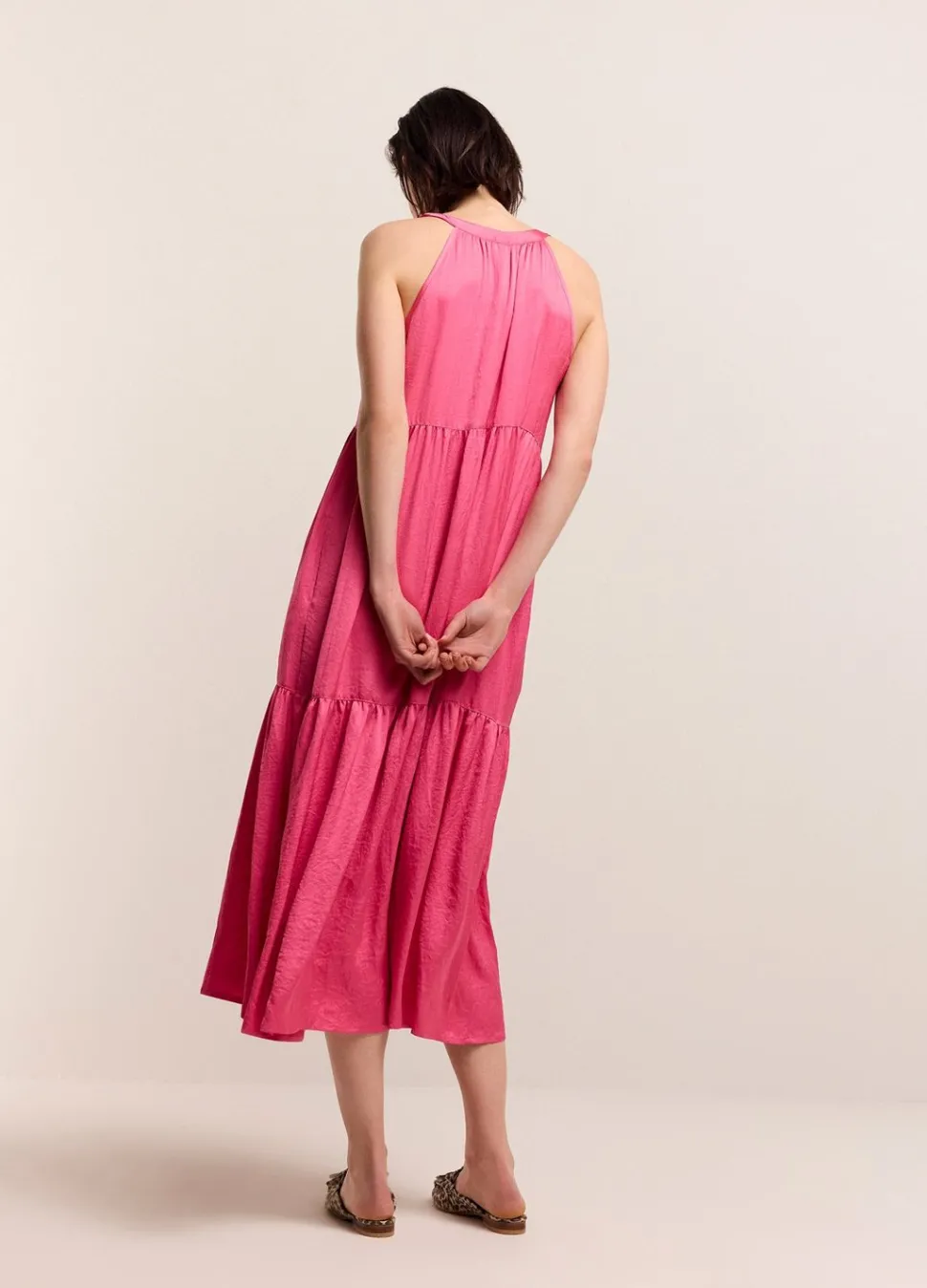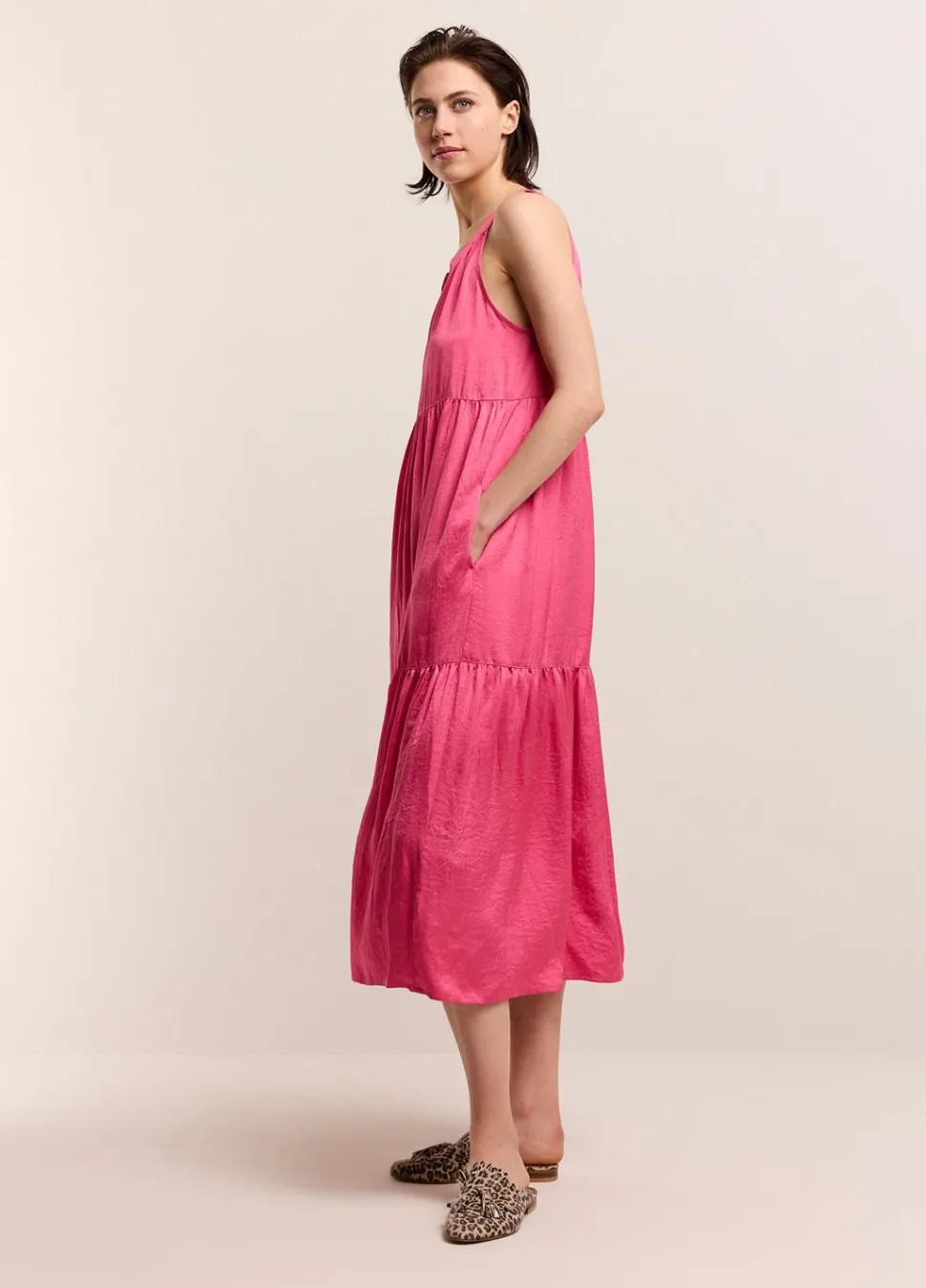 Brede Strokenjurk Zonder Mouwen Van Een Licht Glanzende, Soepele Stof. De Jurk Heeft Een Ronde Hals Met V-Split En Insteekzakken.