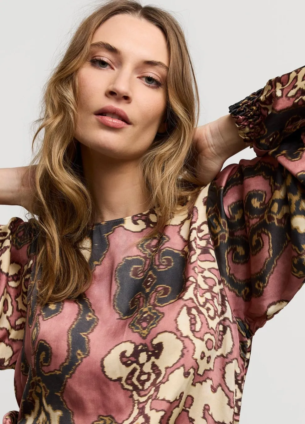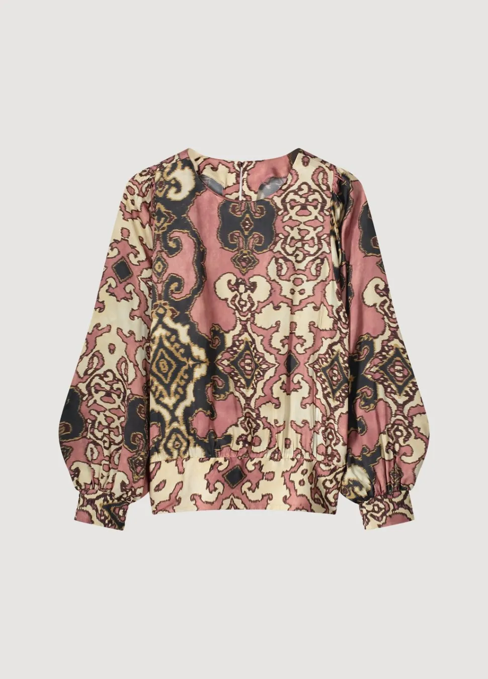 Top Met Ronde Hals En Splitje In De Nek Gemaakt Van Een Licht Glanzende, Bedrukte Stof. De Top Heeft Pofmouwen Met Gedeeltelijk Gesmokte Manchetten.