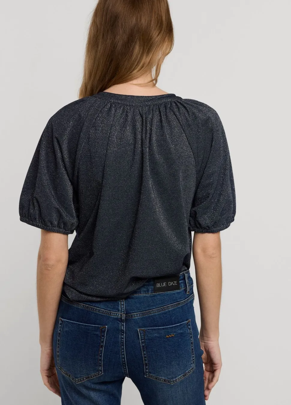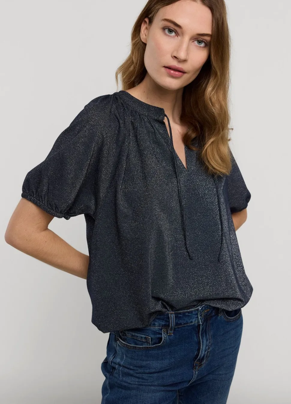 Glimmende Top Van Rekbare Lurex-Stof Met Metallic Garen En Korte Mouwtjes Met Elastiek. De Top Heeft Een Ronde Hals Met Split, Een Koordsluiting En Een Elastische Onderkant.