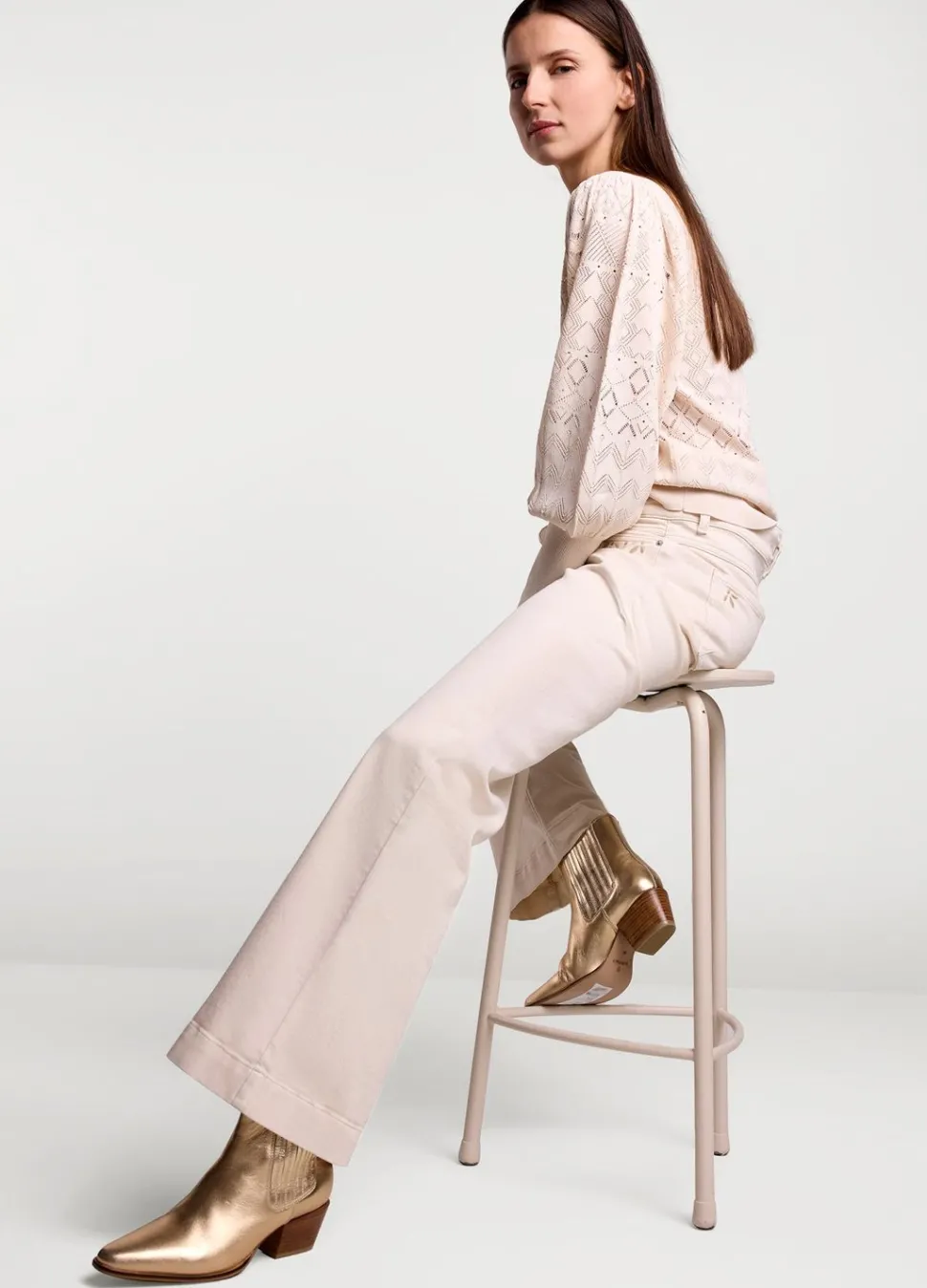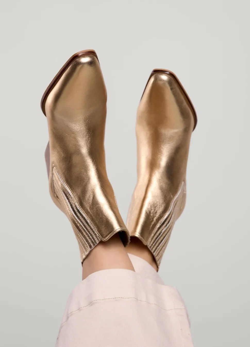 Halfhoog Laarsje In Een Witgouden Metallic Kleur. De Schacht Is Zowel Aan De Binnen- Als De Buitenkant Uitgevoerd Met Elastiek. Br≫