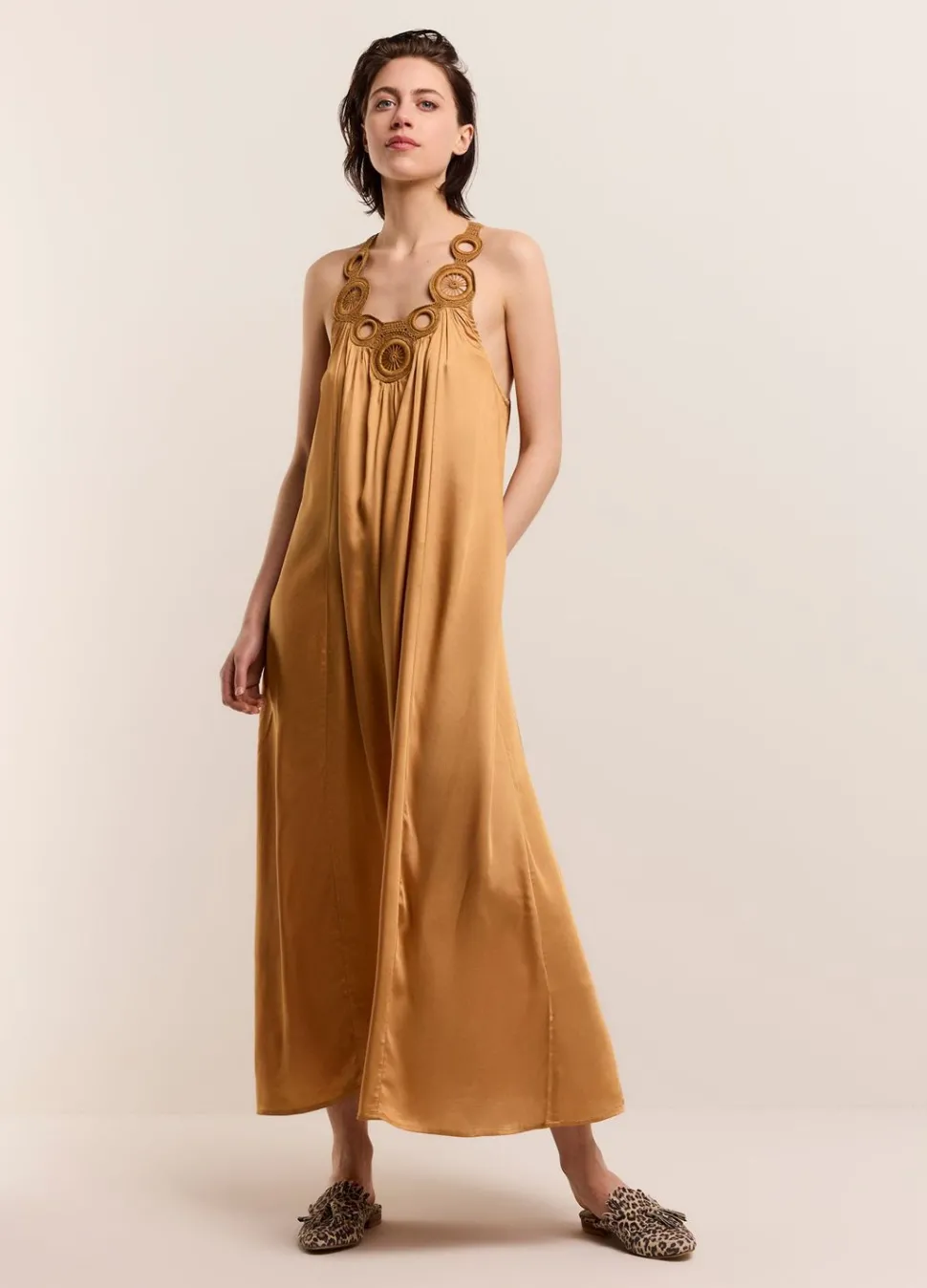Halterjurk Met Gehaakte Halslijn, Gemaakt Van Een Licht Glanzende Viscose-Satijnstof. De Mouwloze Jurk Heeft Een Wijde Pasvorm En De Stof Valt Vanaf De Halslijn Soepel Geplooid Naar Beneden.