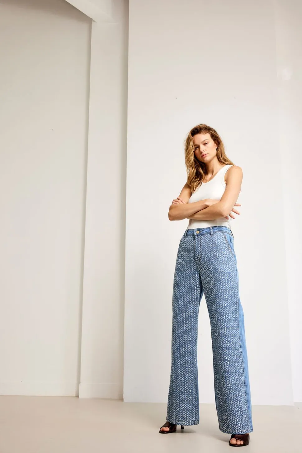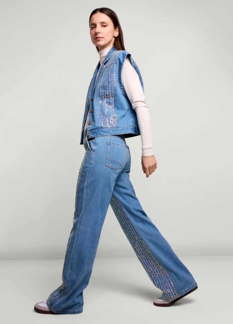 Jeans Met Wijde Pijpen En Ontworpen Met Opvallend Pailletten-Patroon Op De Voorkant. De Jeans Heeft Steekzakken Voor En Een Gulp Met Ritssluiting