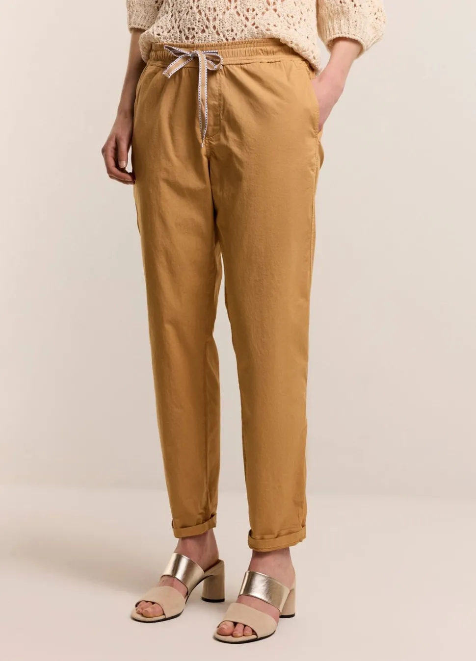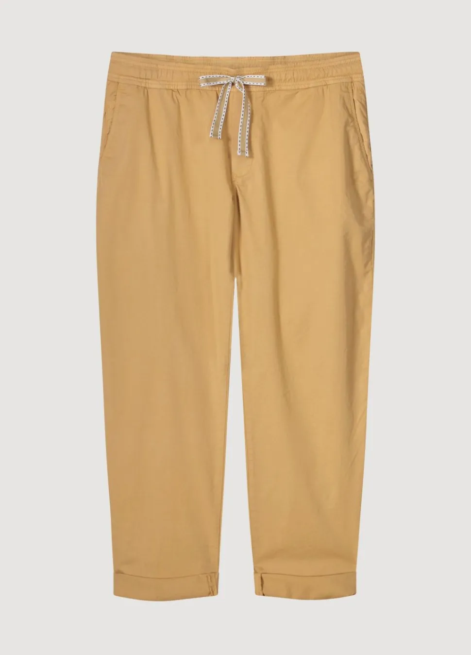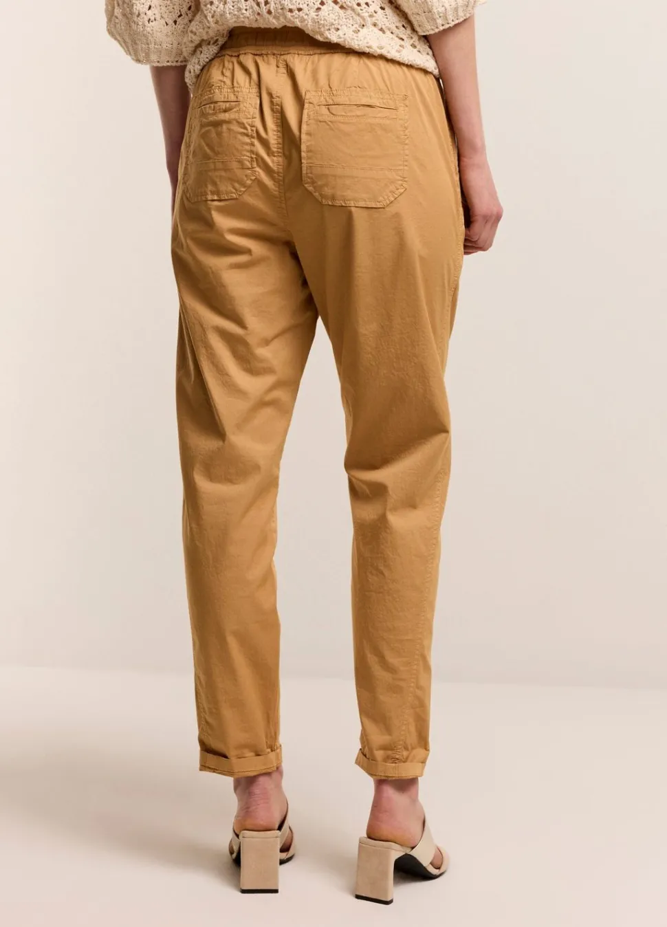 Smal Toelopende Broek Met Een Relaxte Fit, Gemaakt Van Een Zachte Stretch Stof. De Broek Heeft Opgestikte Zakken Achter En Een Elastische Tailleband Met Een Trekkoord.