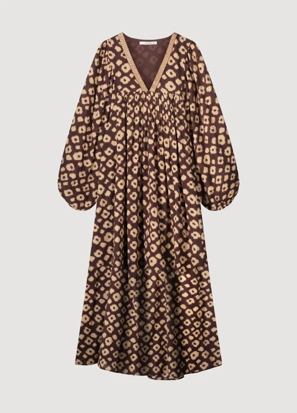 Kaftan Jurk Van Bedrukt Katoen Met Voering En Ballonmouwen. De Jurk Heeft Een Lage V-Hals En Valt Geplooid Vanaf Borsthoogte Naar Beneden.