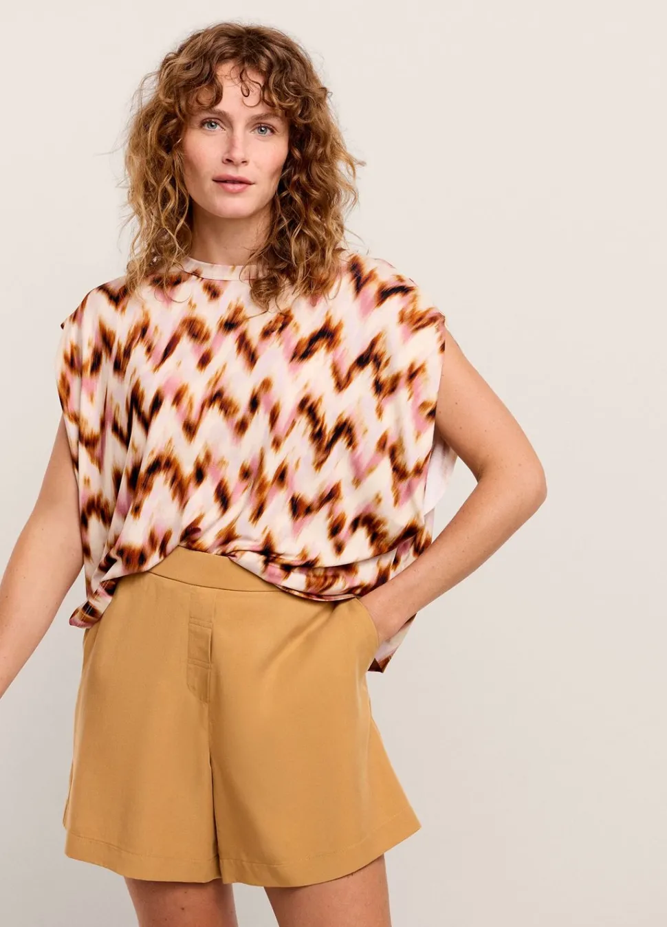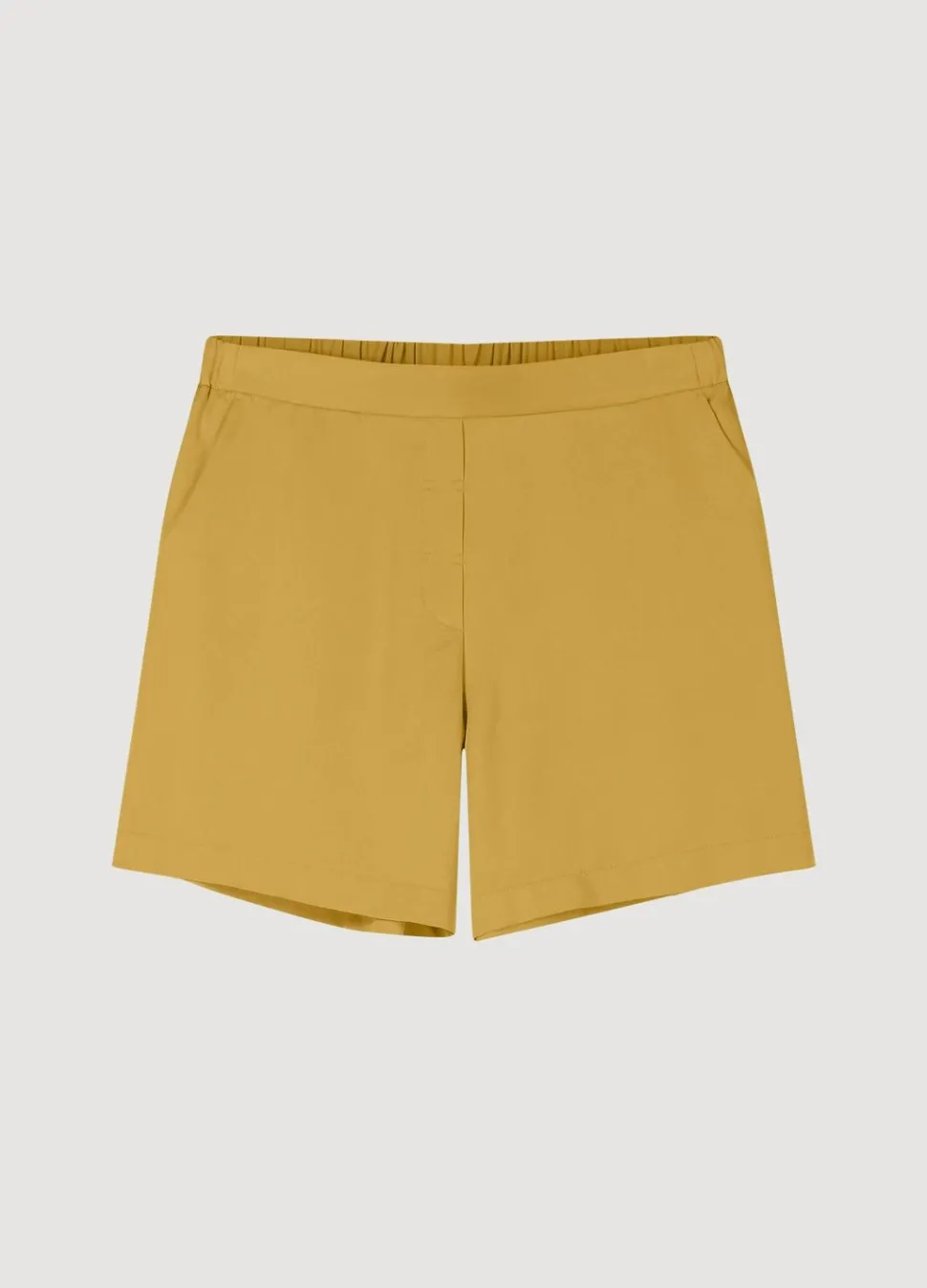 Korte Broek Met Iets Wijde Pijpen, Gemaakt Van Een Zachte Soepele Stof. De Broek Heeft Een Sier-Ritssluiting En Een Elastiek In De Taille Aan De Achterkant.