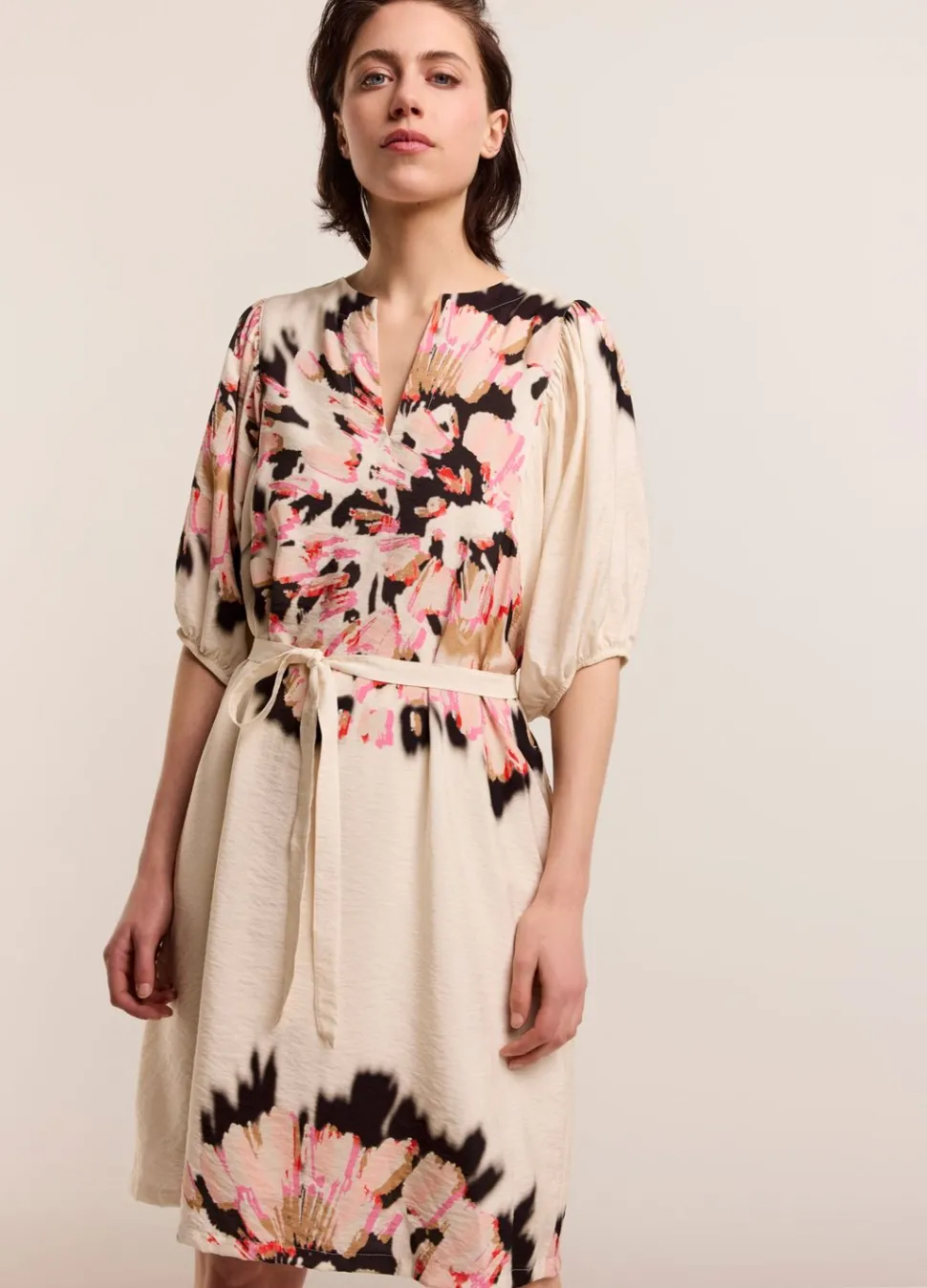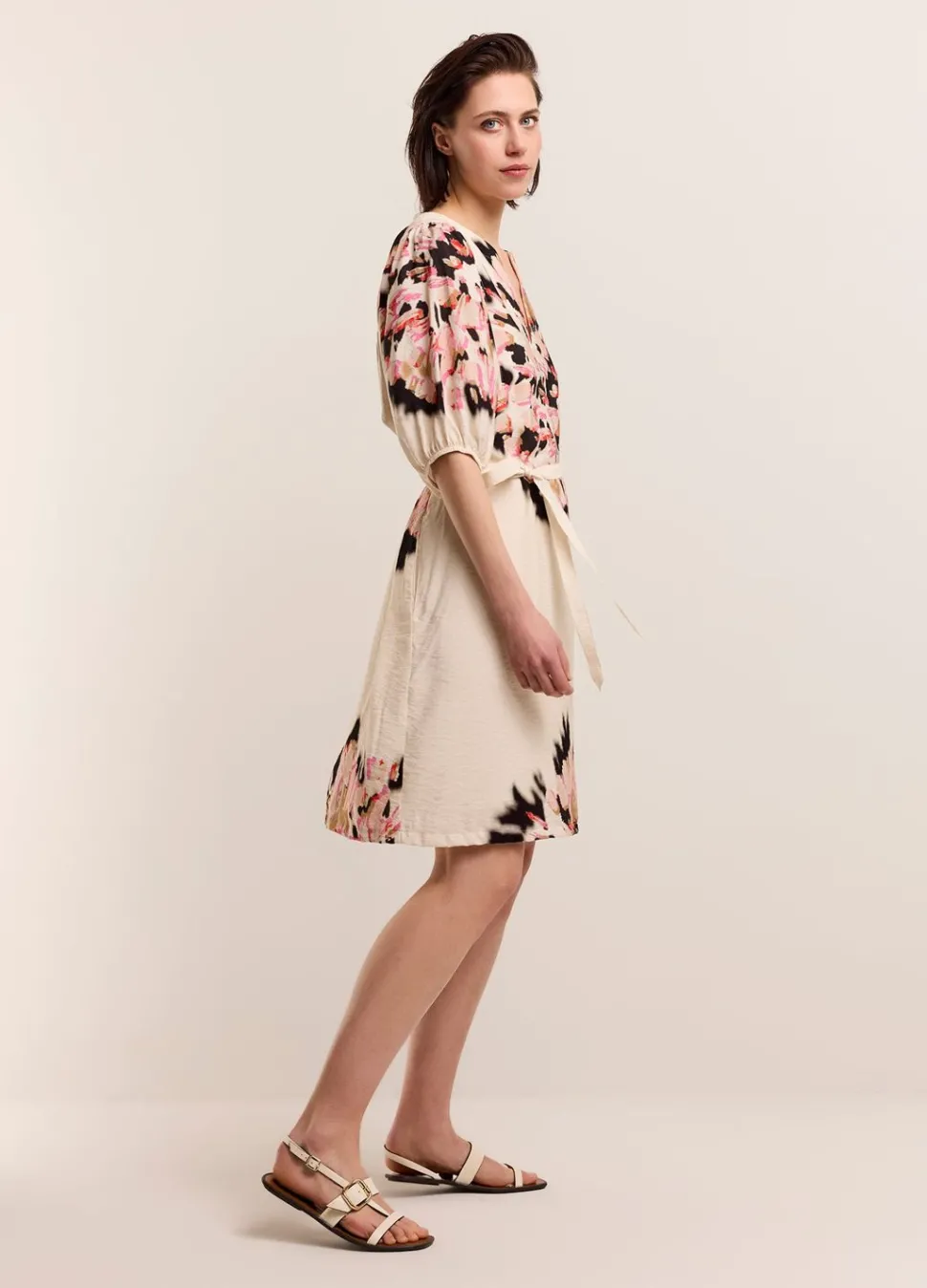 Soepelvallende Korte Jurk Met Pofmouwen. De Jurk Heeft Een Stoffen Koordje In De Taille En Een Ronde Hals Met V-Split. Door De Willekeurige Print Is Iedere Jurk Uniek.
