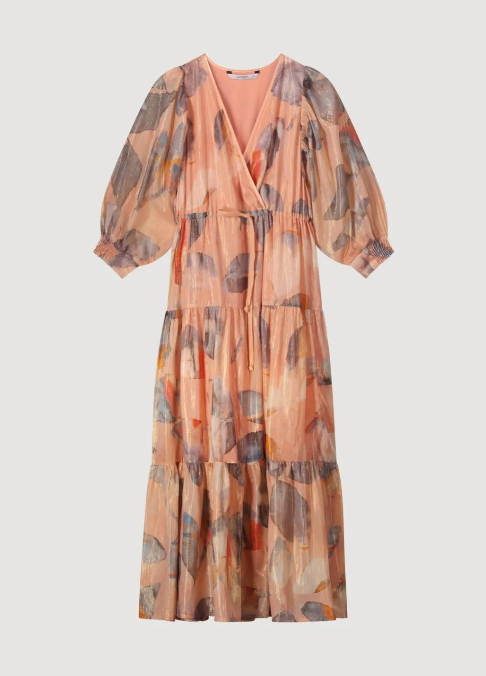 Lange Strokenjurk Met Overslagtop Gemaakt In Een Glinsterende Lurex Garenmix. De Jurk Heeft Pofmouwen Met Gedeeltelijk Gesmokte Manchetten.