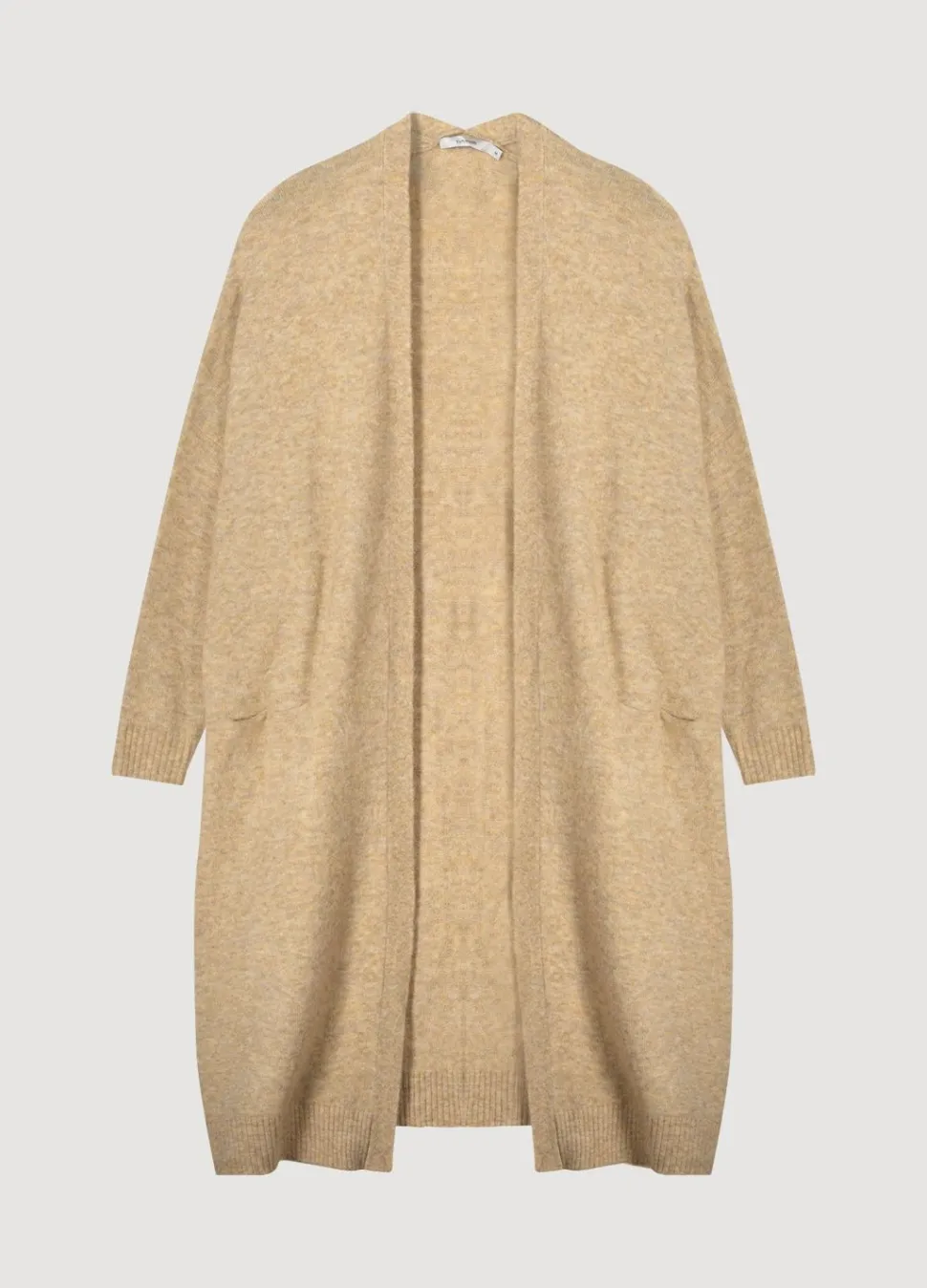Licht Oversized Vest Op Knielengte. Het Open Vest Is Gebreid In Gemêleerd Garen En Voorzien Van Blinde Zakken