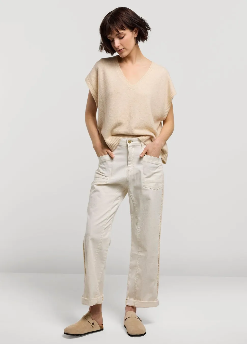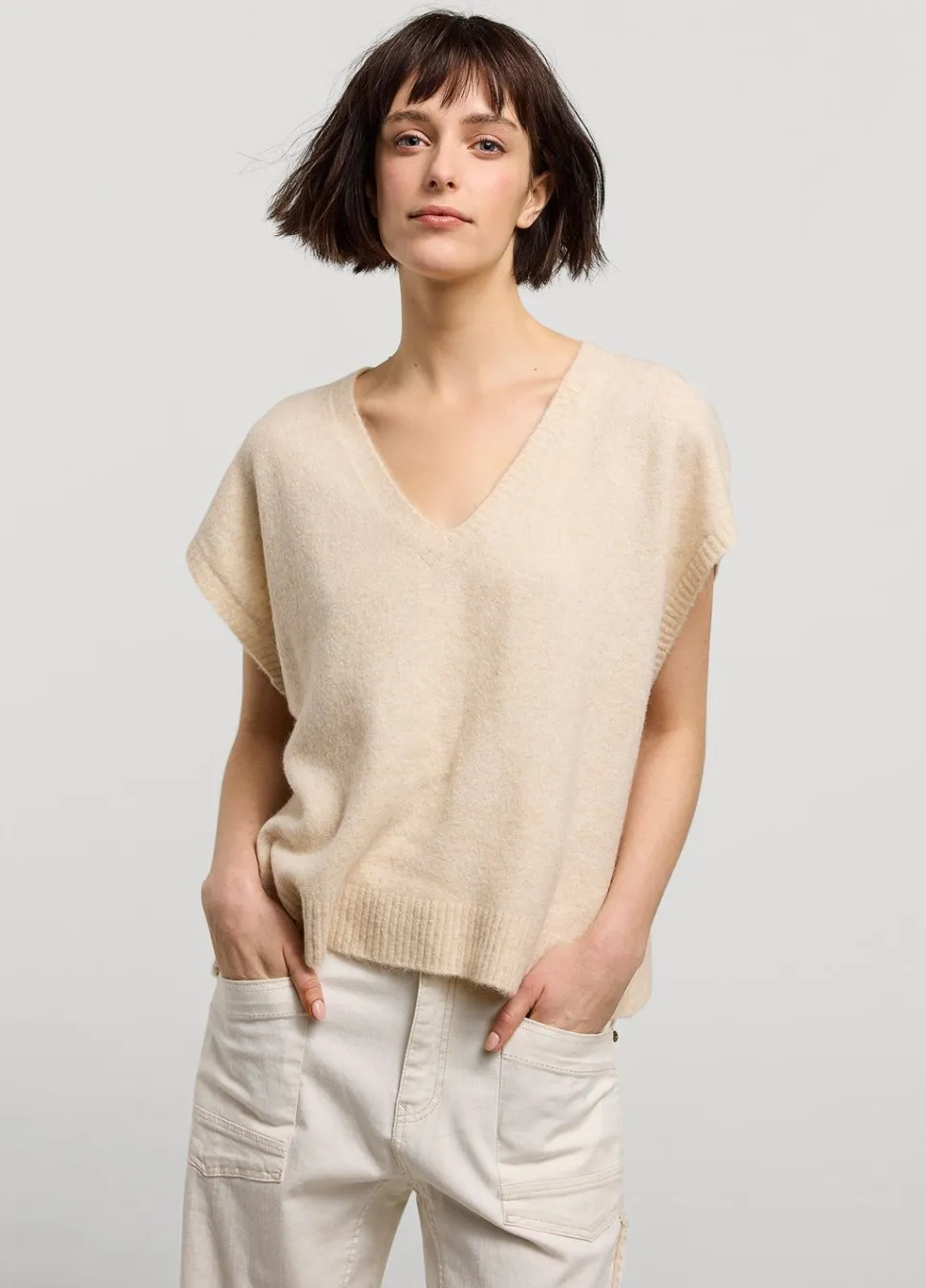 Zachte Oversized Trui In Gemêleerd Garen. De Mouwloze Trui Heeft Een Diepe V-Hals En Wijde Armsgaten.