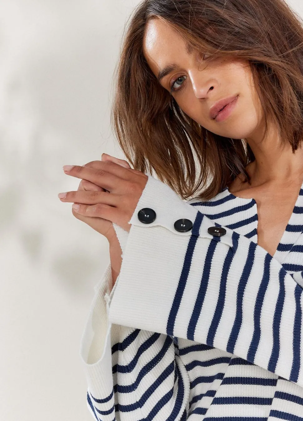 Oversized Streepjestrui Met Ronde Hals En V-Split. De Wijde Mouwen Zijn Verlaagd Aangezet En Voorzien Van Knoopjes Bij De Boorden.