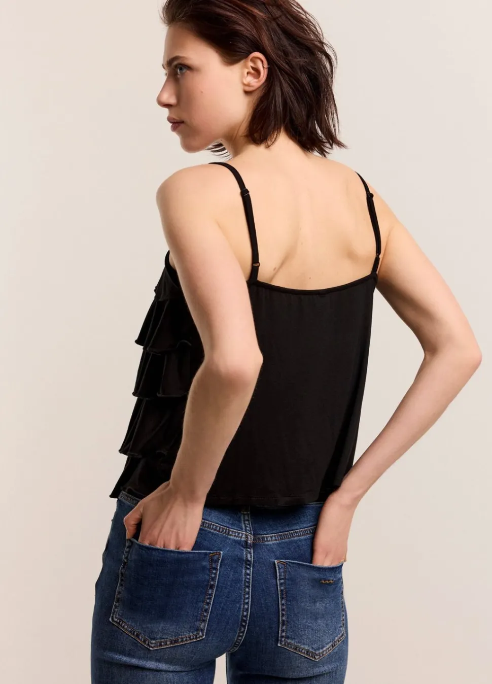Spaghettitop Met Ruches Aan De Voorkant, Gemaakt Van Een Soepelvallende Viscose Jersey Stof. De Top Heeft Een Relaxte Pasvorm Met Verstelbare Spaghettibandjes.