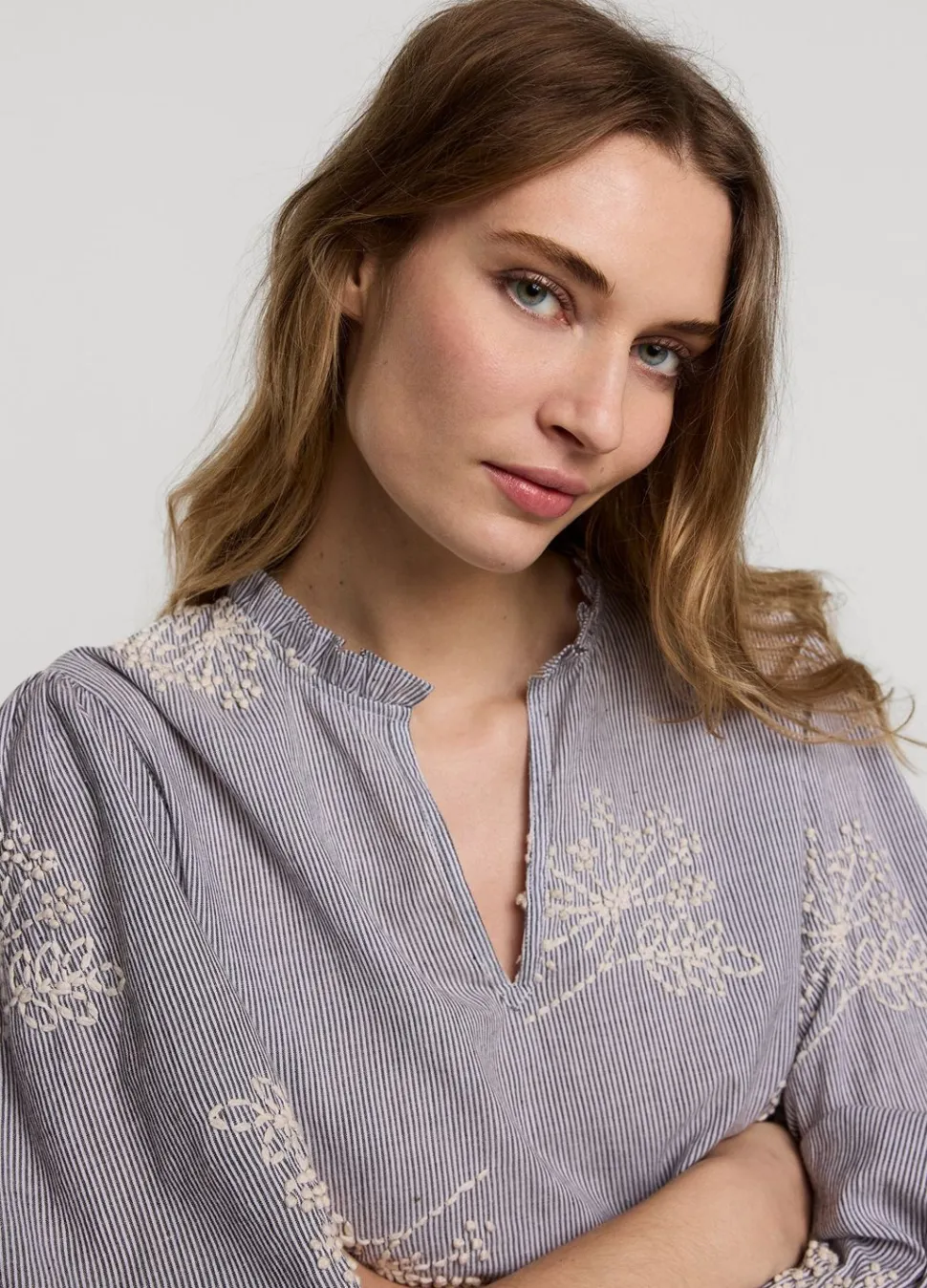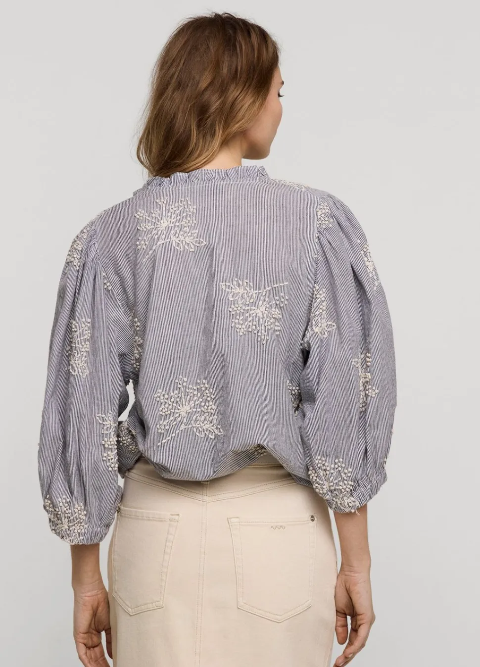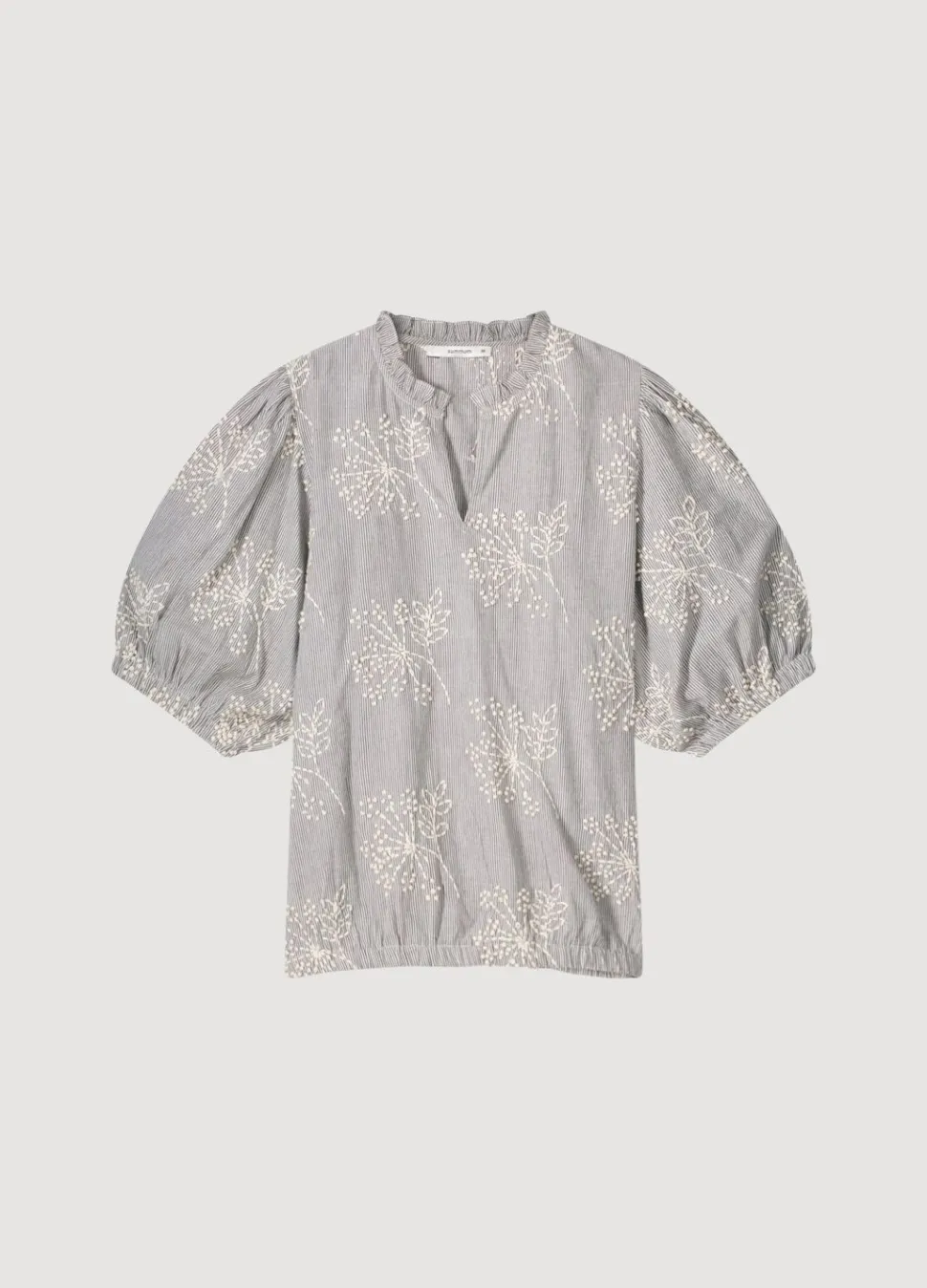 Streepjes Blouse Van Comfortabel Katoen Met Handgeborduurde Bloemen. De Blouse Heeft Korte Ballonmouwen Met Elastiek En Een Ronde Hals Met Ruches En Split.