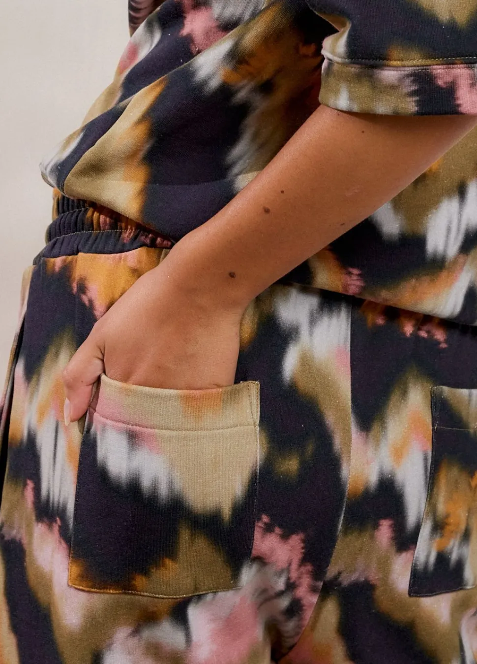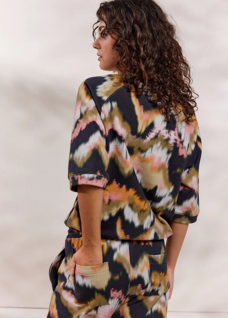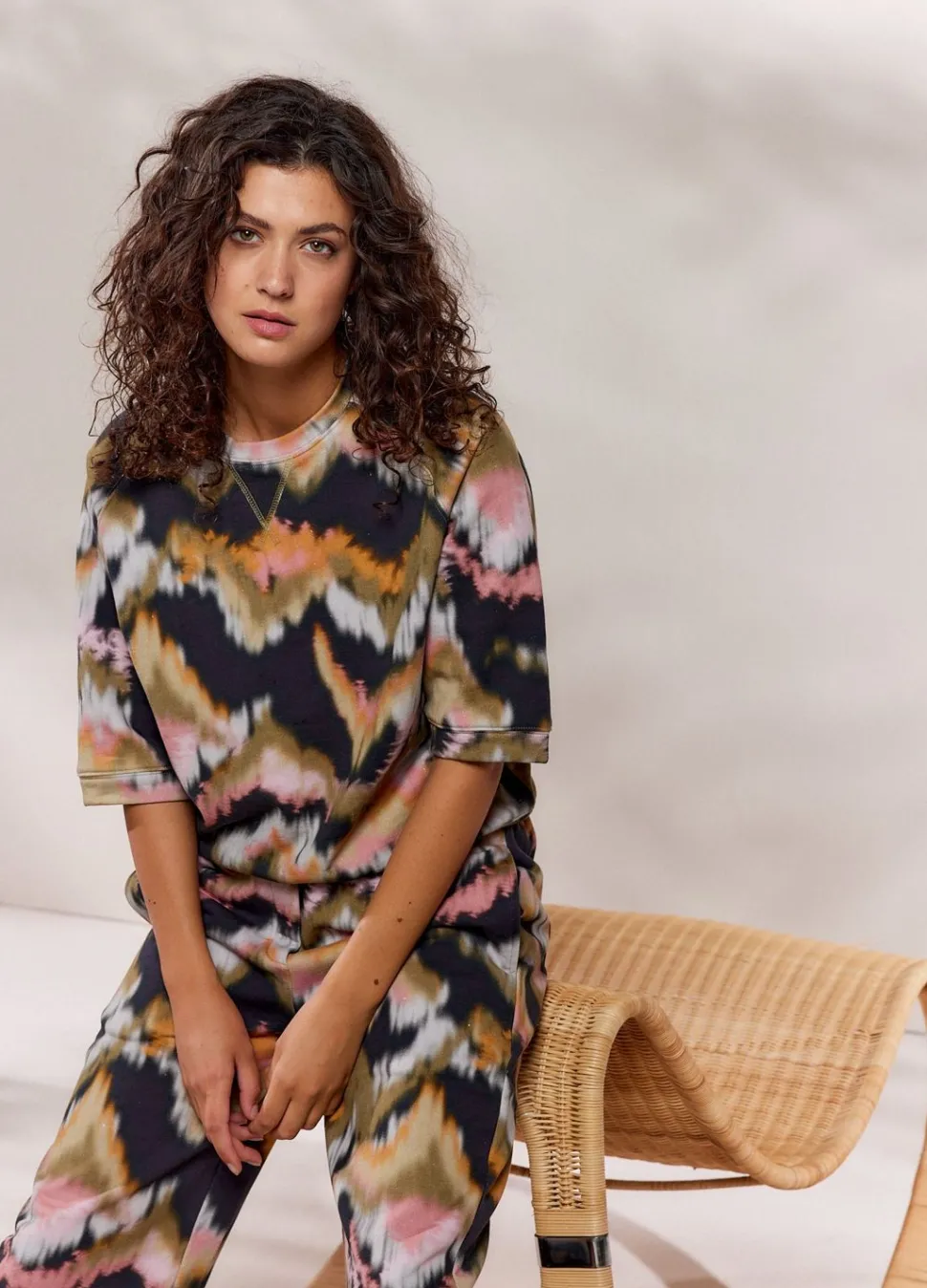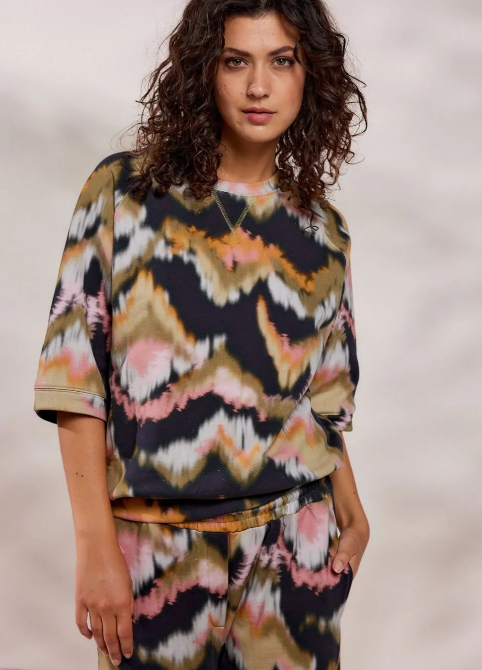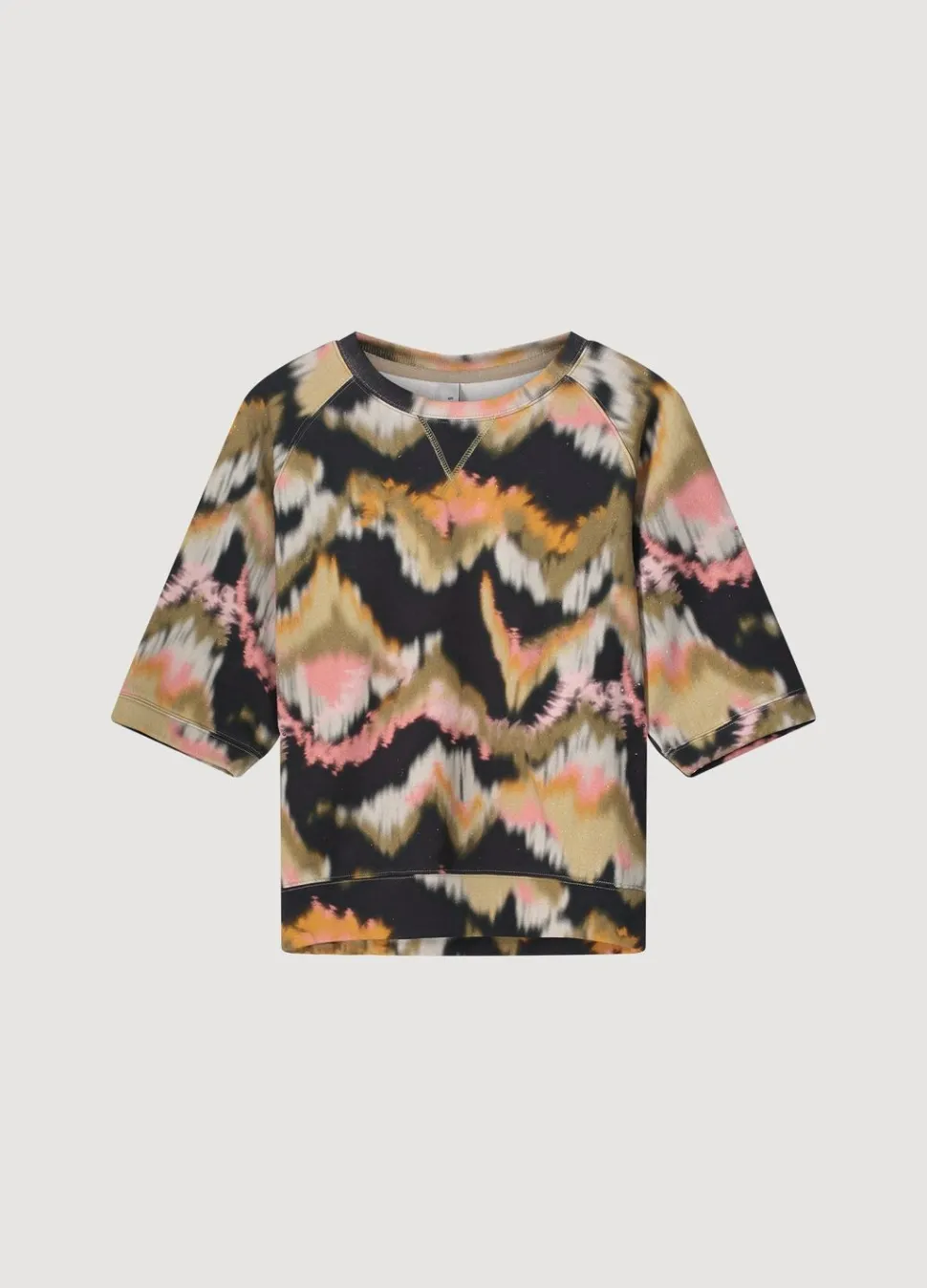 Sweatshirt Van Een Katoenen Stof Met Waterverf-Print. De Top Heeft Een Normale Pasvorm, Een Wijde Halslijn En Korte Mouwen.