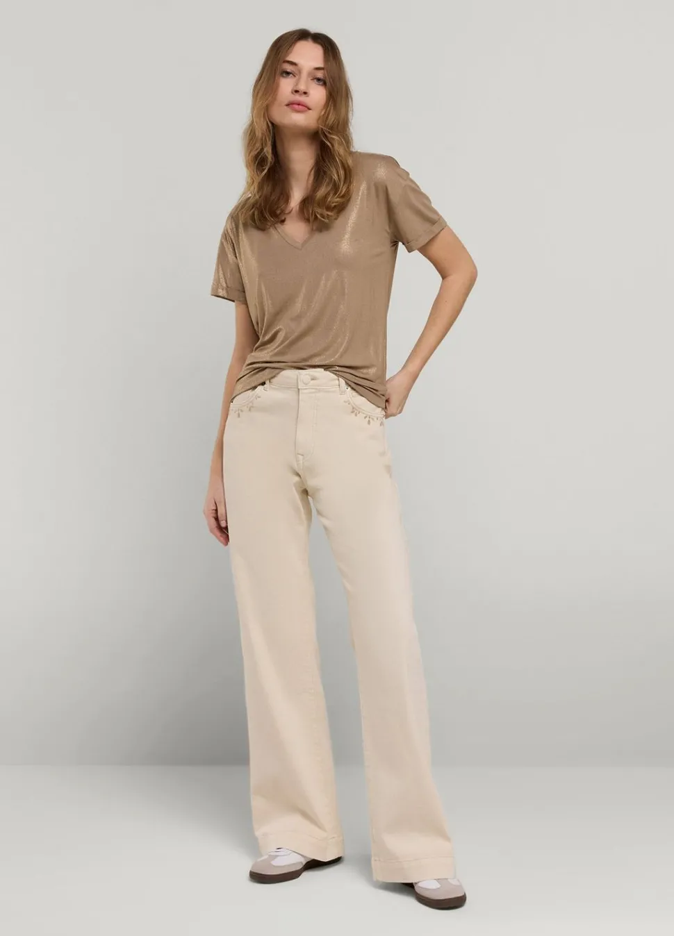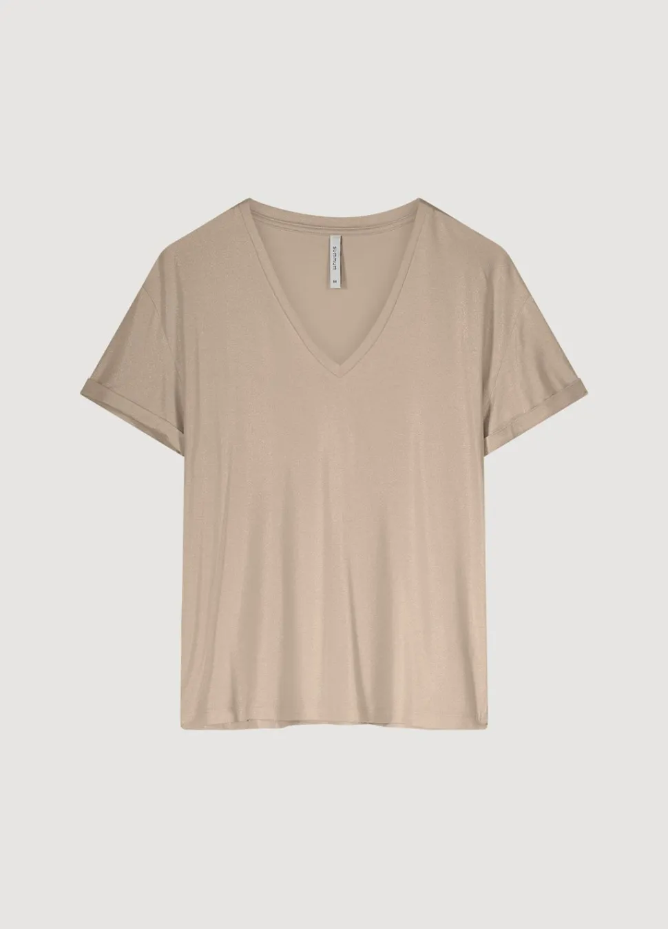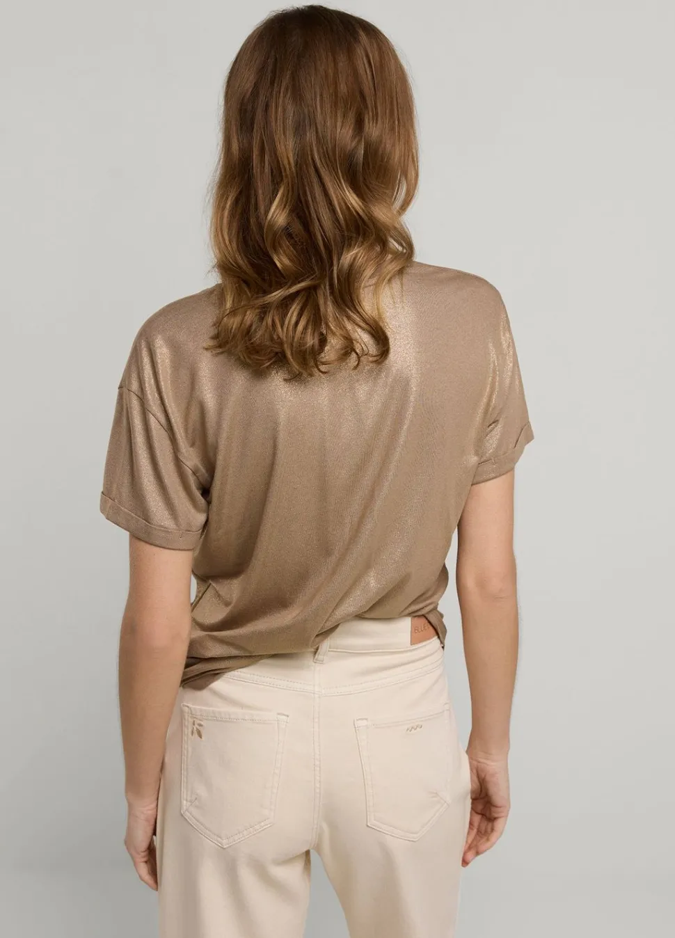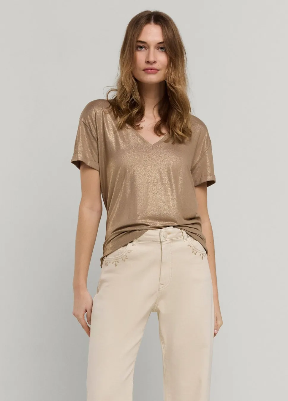 Glimmend T-Shirt Met Een Brede V-Hals En Korte Verlaagde Mouwtjes Met Omgeslagen Boorden. De Top Is Gemaakt Van Soepelvallende Stof Met Foilprint En Valt Losjes.• T-Shirt Glittercoating