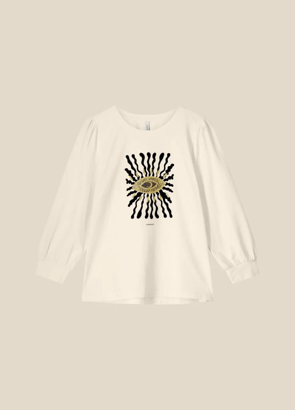 Top Van Elastische Katoen Kwaliteit Met Een Rechte Fit. De Top Heeft 7/8E Mouwen, Een Ronde Hals En Is Bedrukt Met Een Illustratie Op De Voorkant.