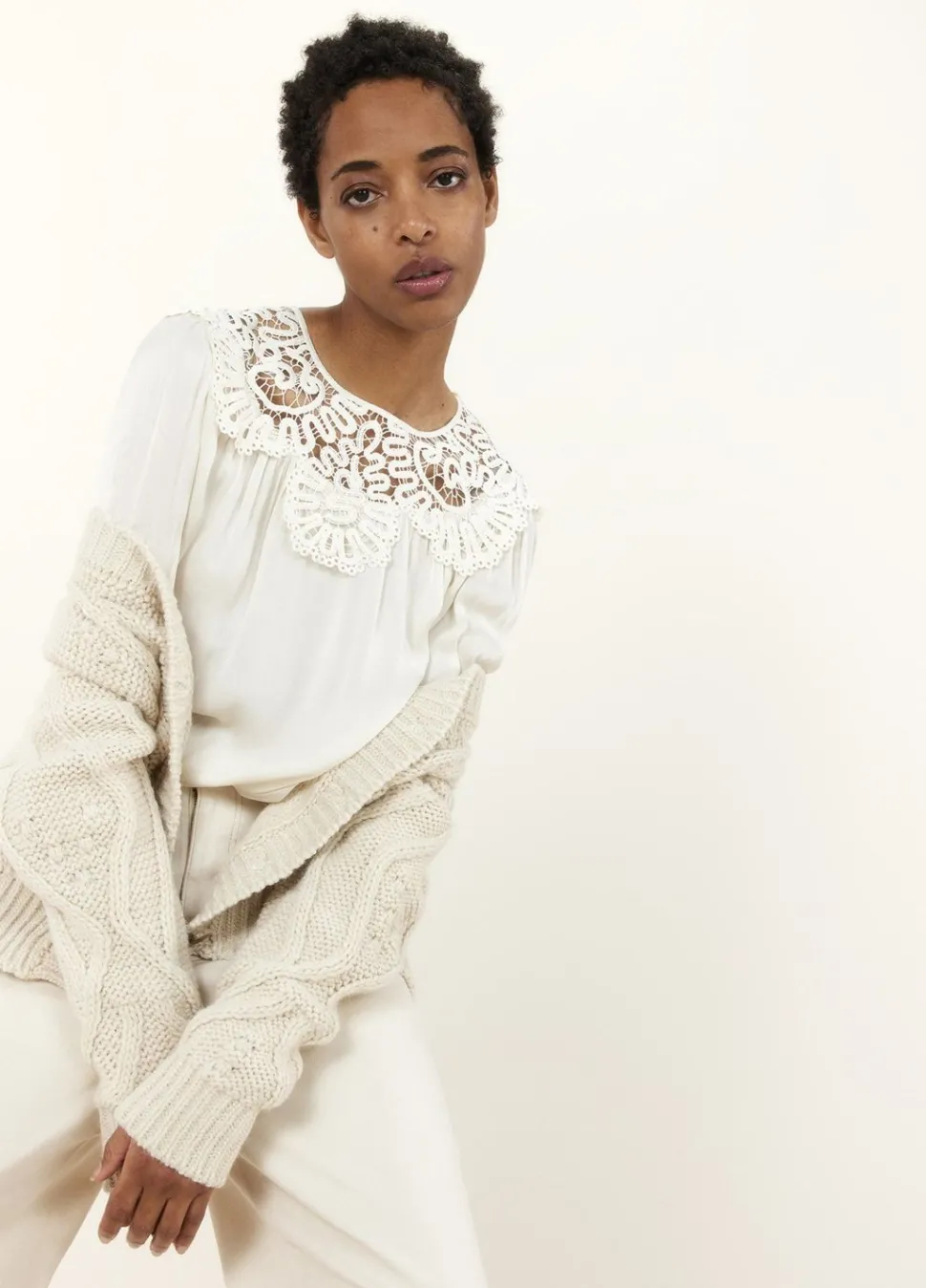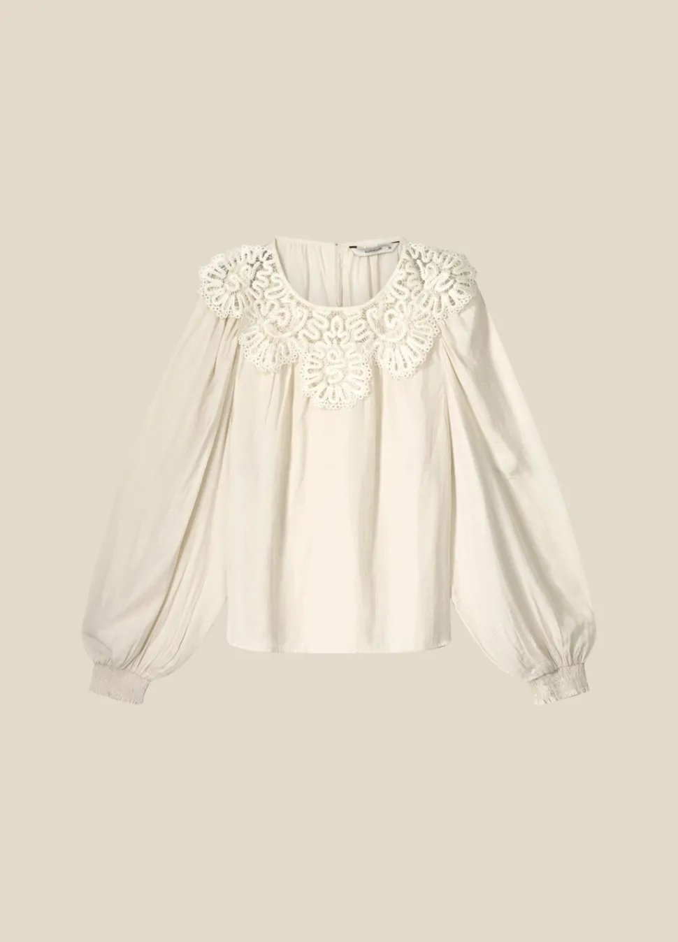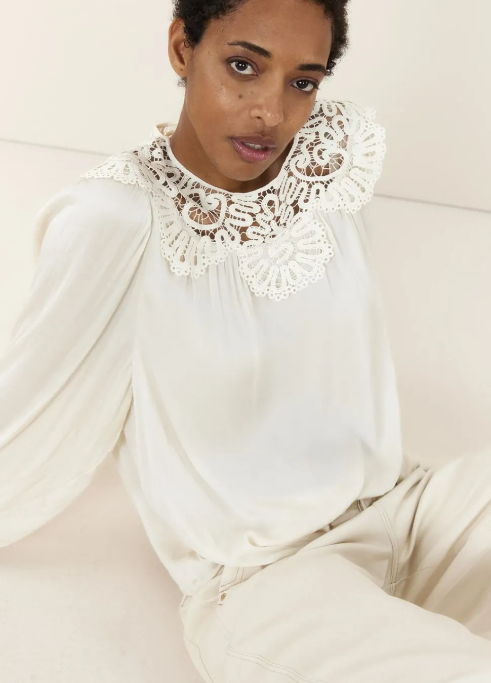 Deze Top Heeft Een Brede Ronde Hals Met Opgelegd Kant En Lange Ballonmouwen. De Top Is Gemaakt Van Een Licht Glanzende Satin Stof.