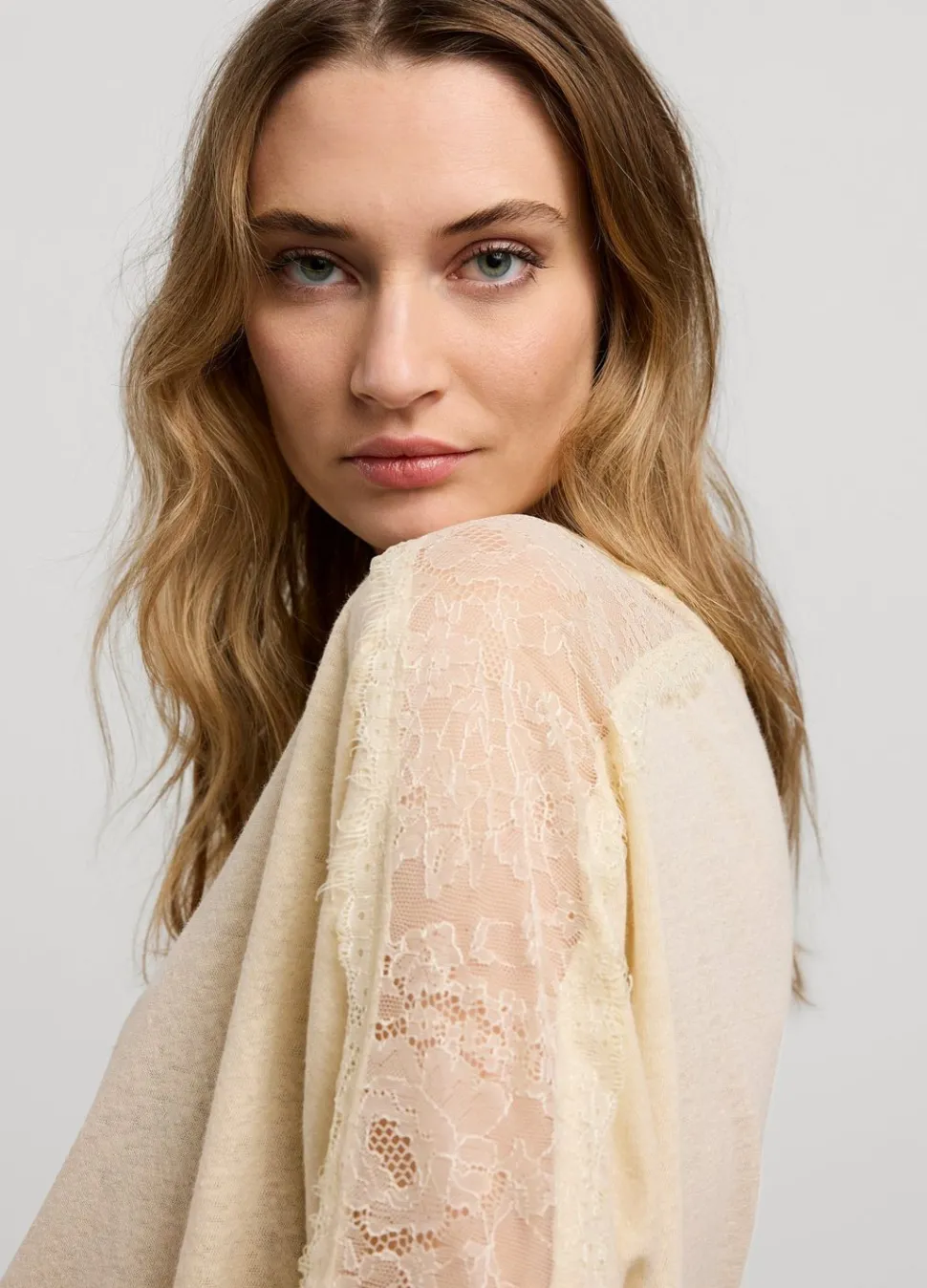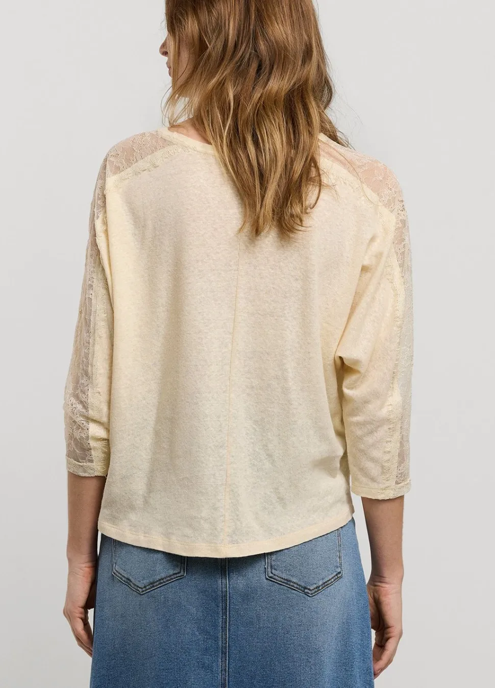 Top Met Gedeeltelijk Opengewerkte Schouderpas En Mouwen. De Top Heeft Een Ronde Hals En Is Gemaakt Van Een Luchtige Linnen-Jersey Mix.