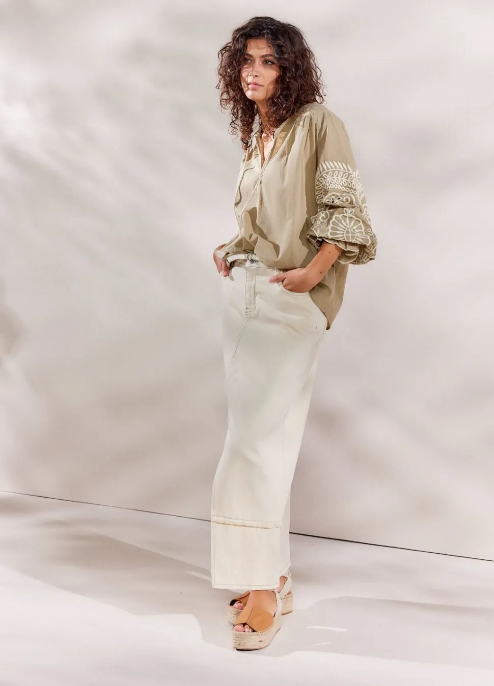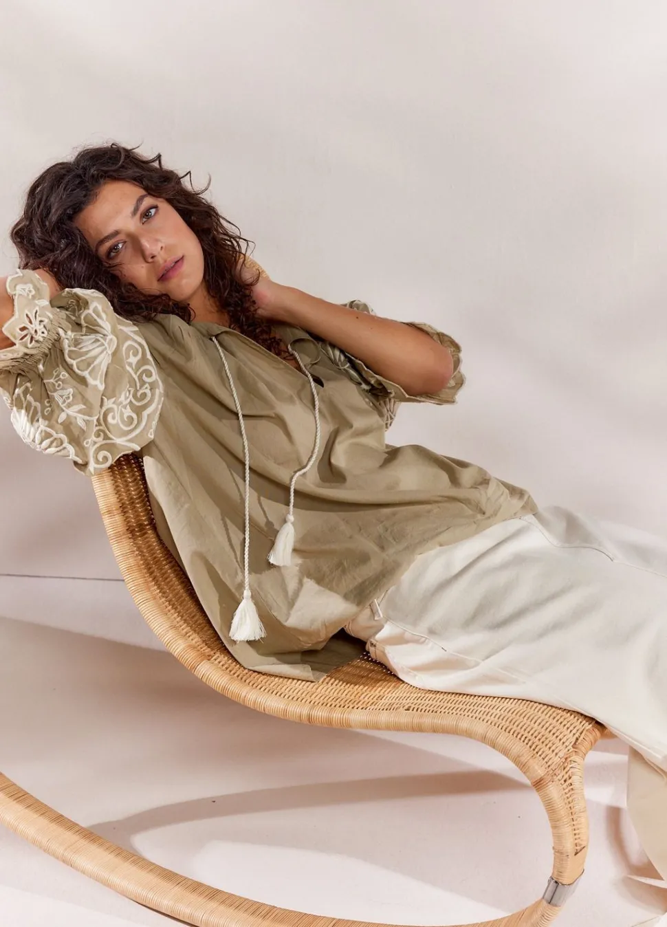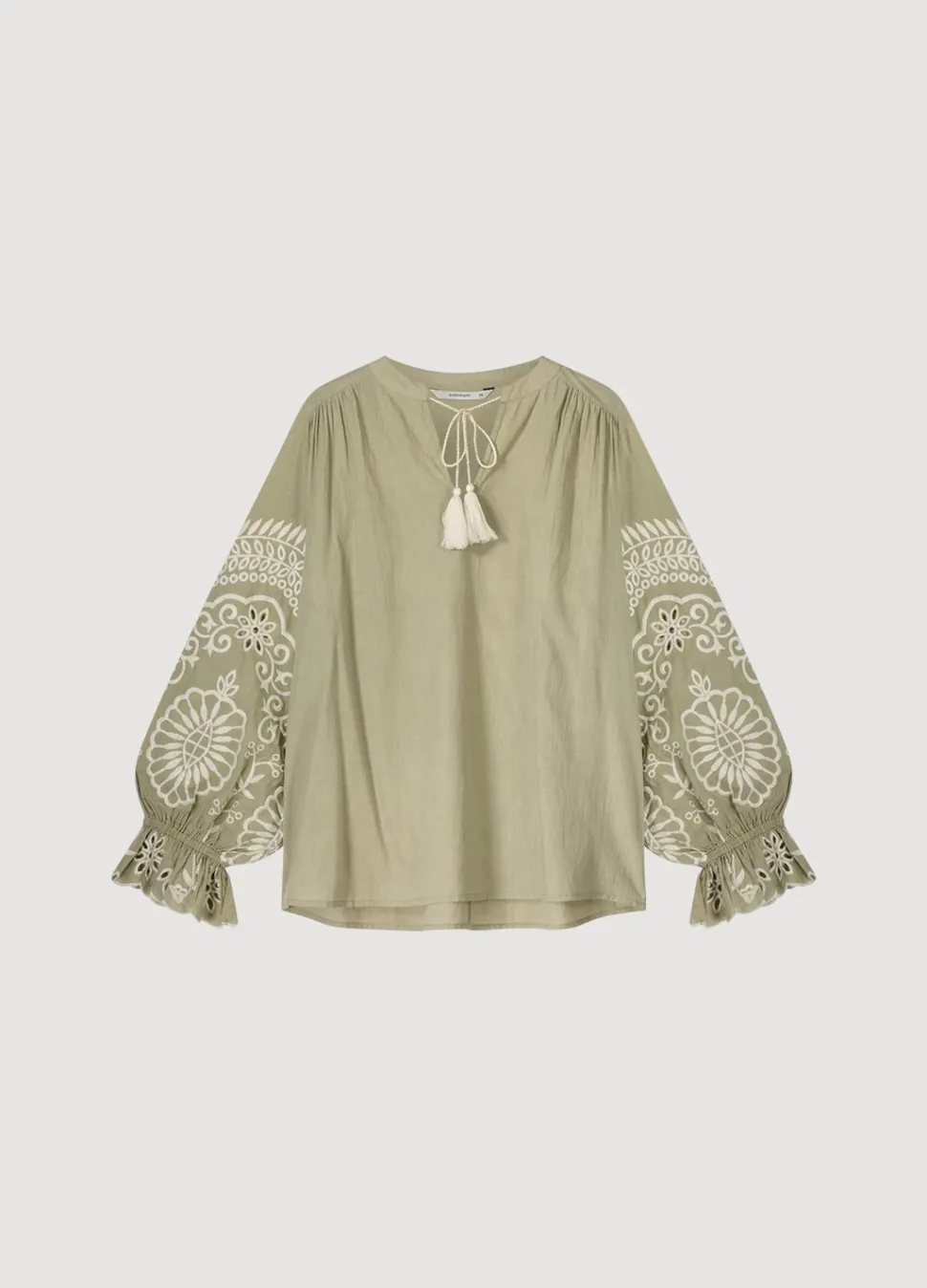 Ruimvallende Top Met Ronde Hals En Koordsluiting Met Kwastjes. De Top Is Geweven Van Zacht Katoen En De Lange Ballonmouwen Zijn Versierd Met Borduurwerk.