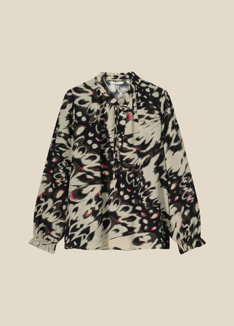 Top Met Abstracte Vlinderpint In Een Soepele, Dichte Kwaliteit Stof. Het Opstaande Kraagje En De Manchetten Van De Pofmouwen Zijn Versierd Met Ruches.