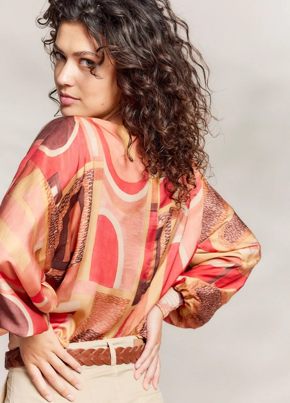 Top Met Smalle Boothals In Een Licht Glanzende, Bedrukte Stof. De Top Heeft Vleermuismouwen Met Gedeeltelijk Gesmokte Manchetten.