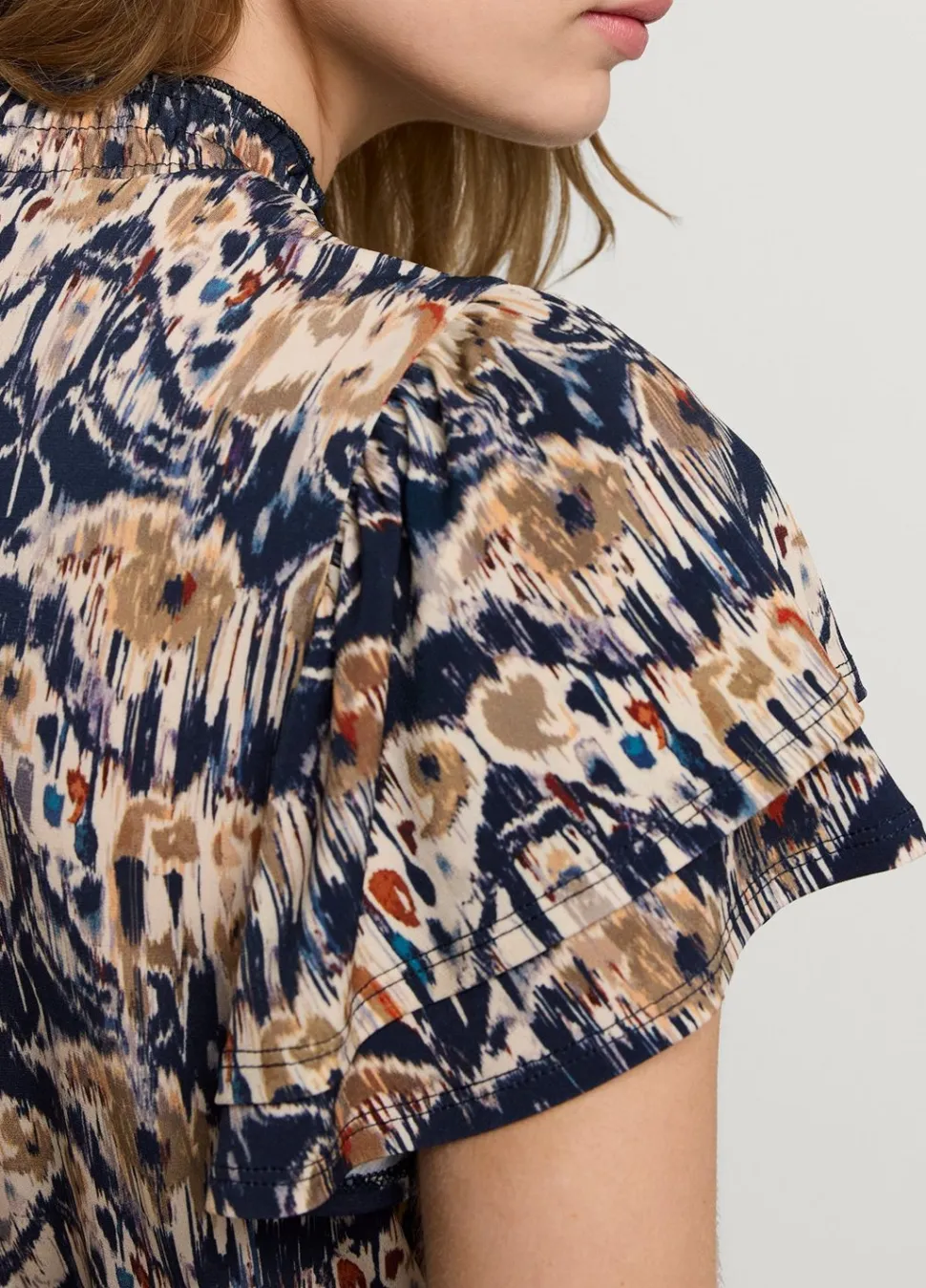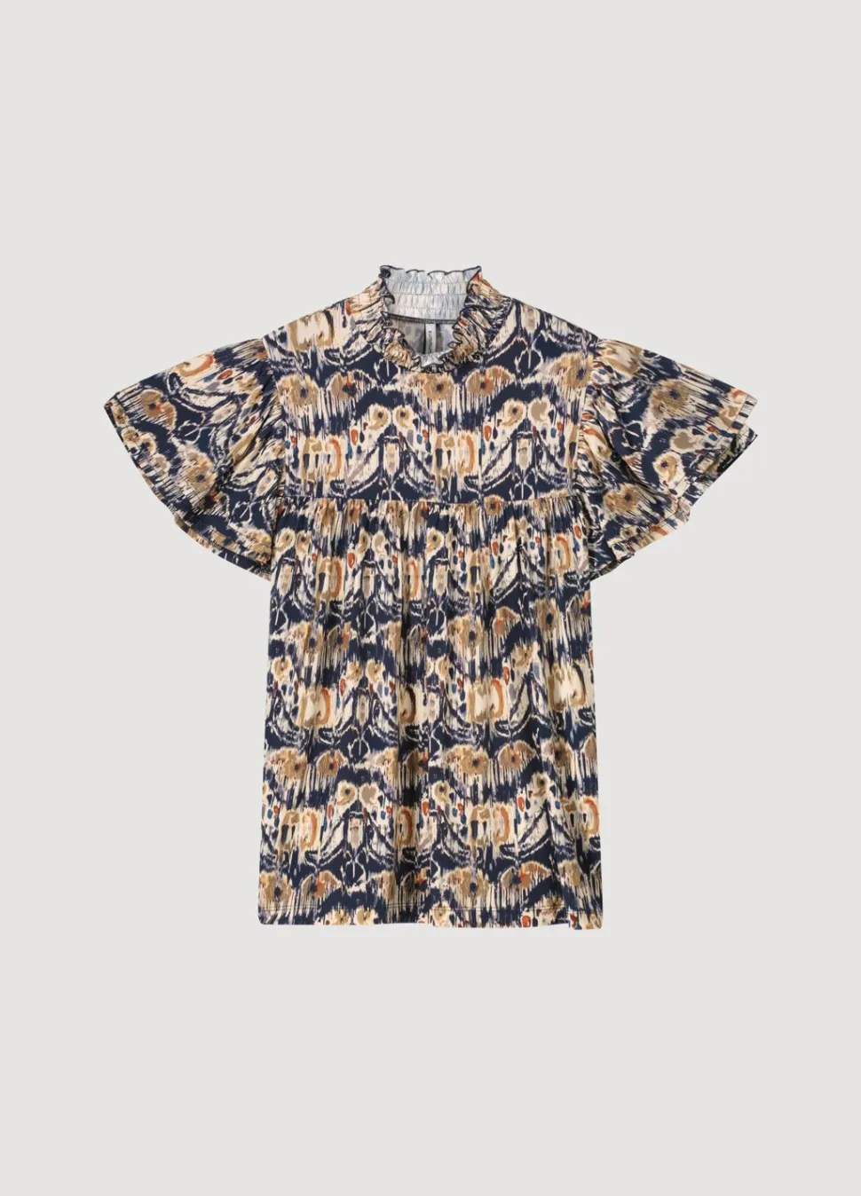Top Met Vlindermouw Met Een Overall Ikat-Print, Gemaakt Van Rekbare, Zachte Jersey Stof. De Top Heeft Een Relaxte Pasvorm En Een Ronde Gemokte Kraag.