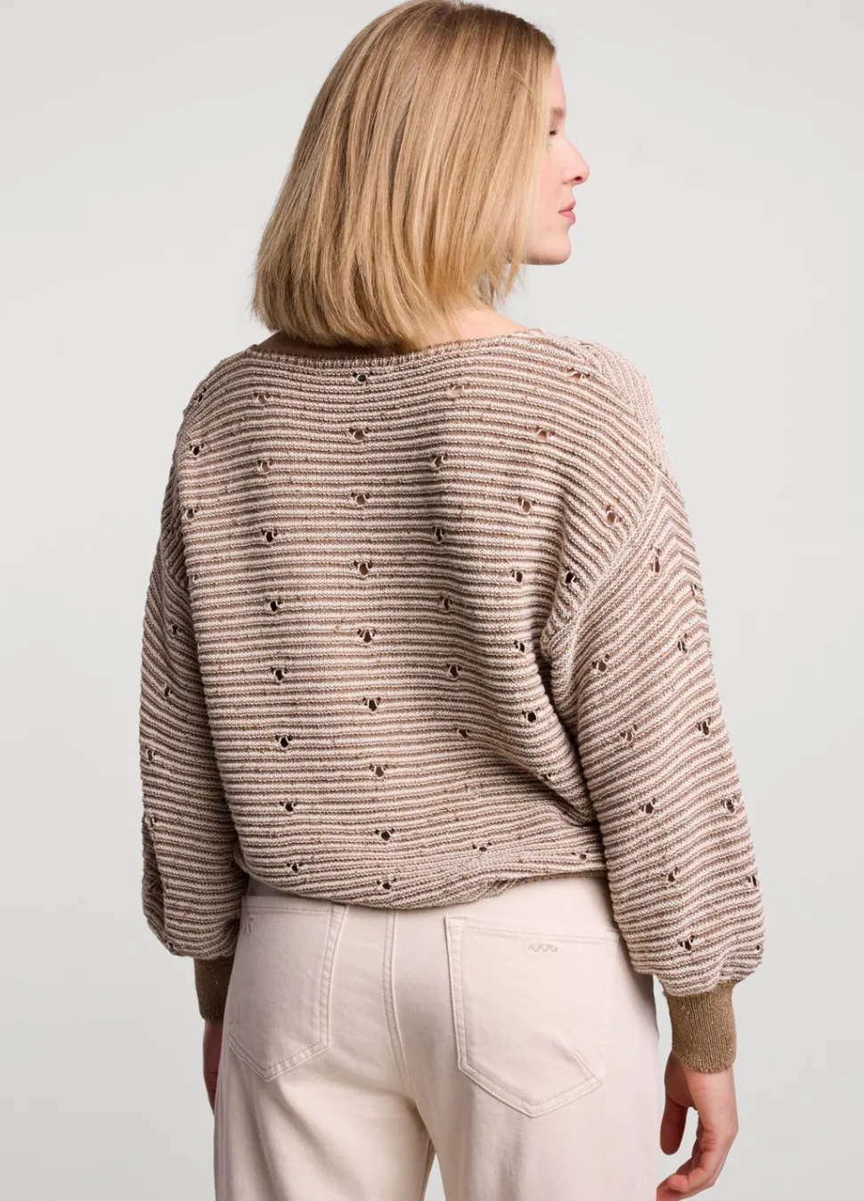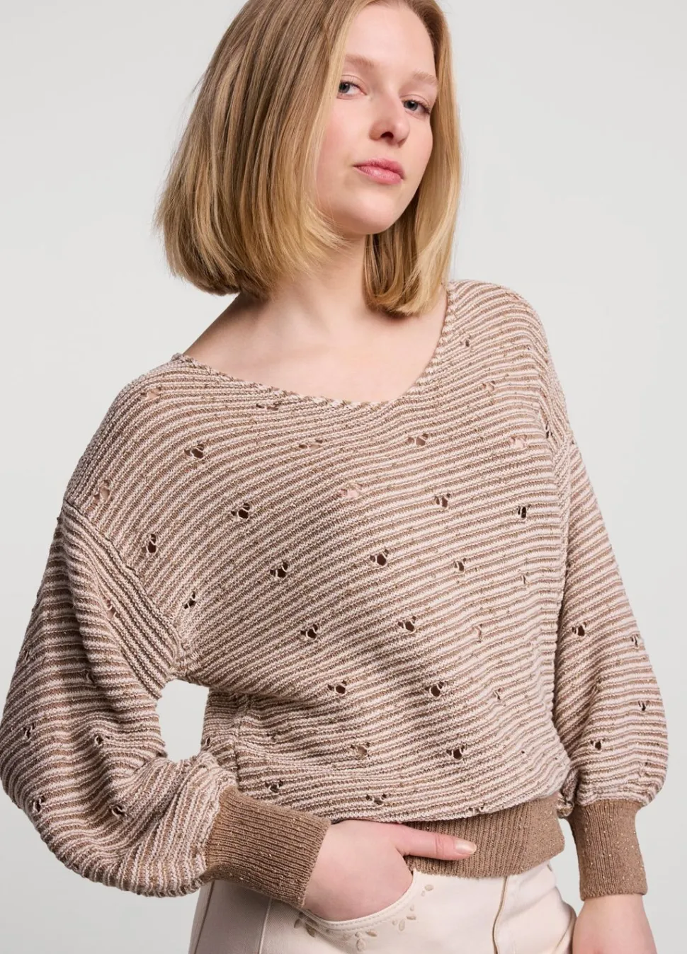 Trui Met Subtiele Lurex Is Ontworpen Met Een Ingebreide Streep En Kleine Gebreide Rondingen. De Trui Heeft Een V-Hals En Pofmouwen.