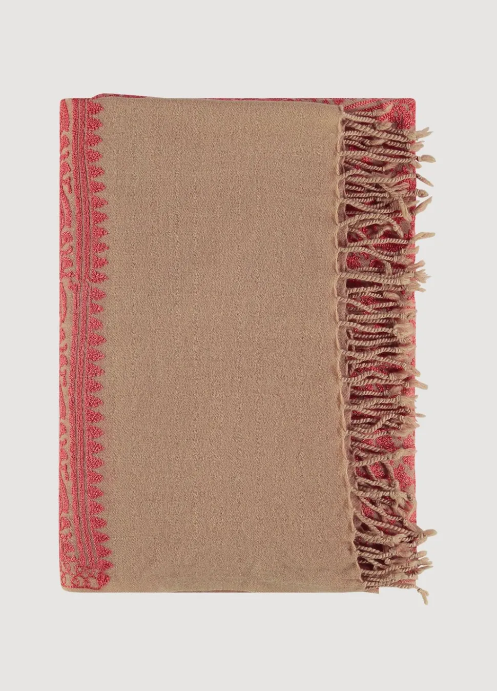 Luxe Wollen Sjaal Met Verfijnd Borduurwerk. De Uiteinden Van De Sjaal Zijn Afgewerkt Met Franjes.