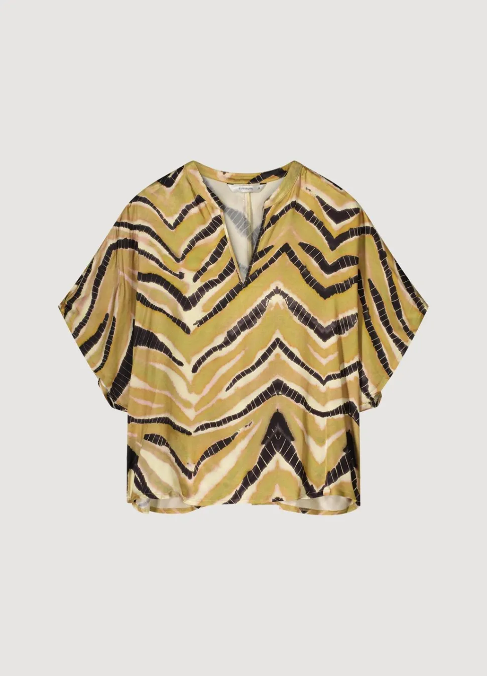 Top Van Licht Glanzend, Soepele Viscose Met Een Artistieke Zigzag-Print. De Top Heeft Aangeknipte Wijde Mouwtjes En Een Staanderkraag Met V-Split.